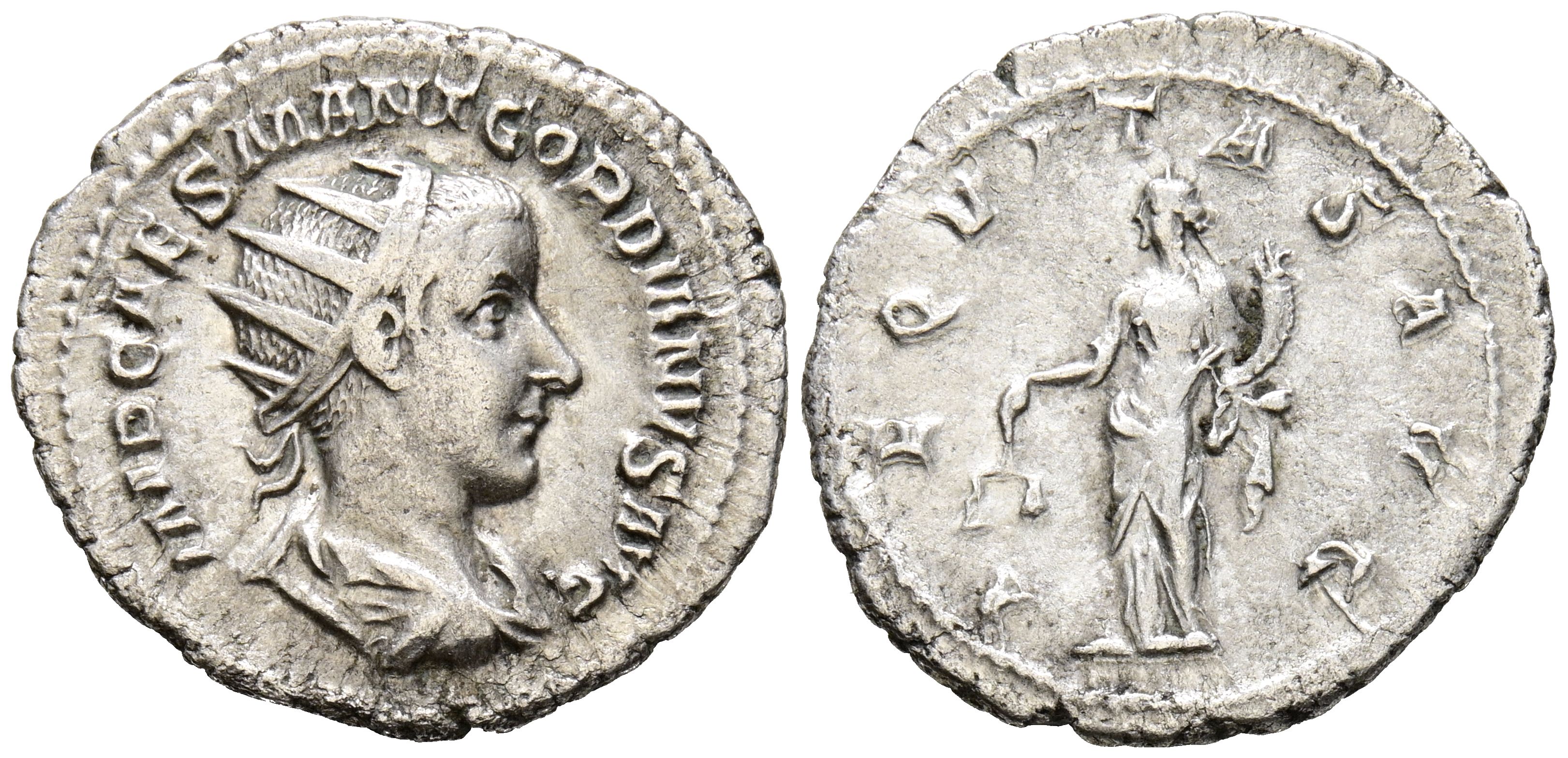 GORDIAN III. Antoninian. (Ar. 3.32g/23mm). 240 AD Rome. (RIC 34). Anv: Radiated and draped bust of Gordian III to the right, around legend: IMP CAES M ANT GORDIANVS AVG. Rev: Aequitas standing on the left carrying scales and cornucopia, around legend: AEQVITAS AVG. Good Very Fine.