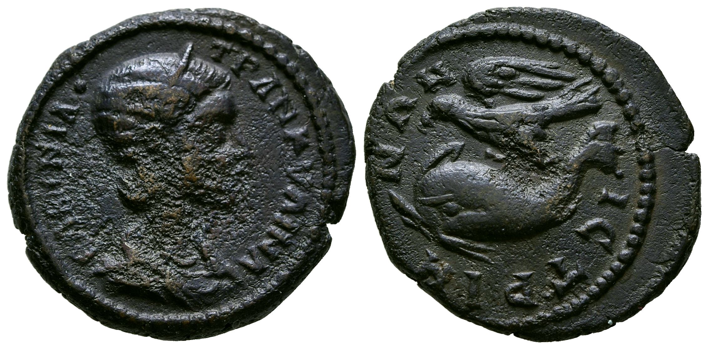 QUIET. Ae24. (Ae. 7.52g/24mm). 241-244 AD Istros. (Varbanov 692; AMNG 529). Anv: Diademed and draped bust of Tranquilina on the right, around Greek legend. Rev: Eagle flying to the left with a dolphin in its talons, around Greek legend. Very Fine/ Good Very Fine.