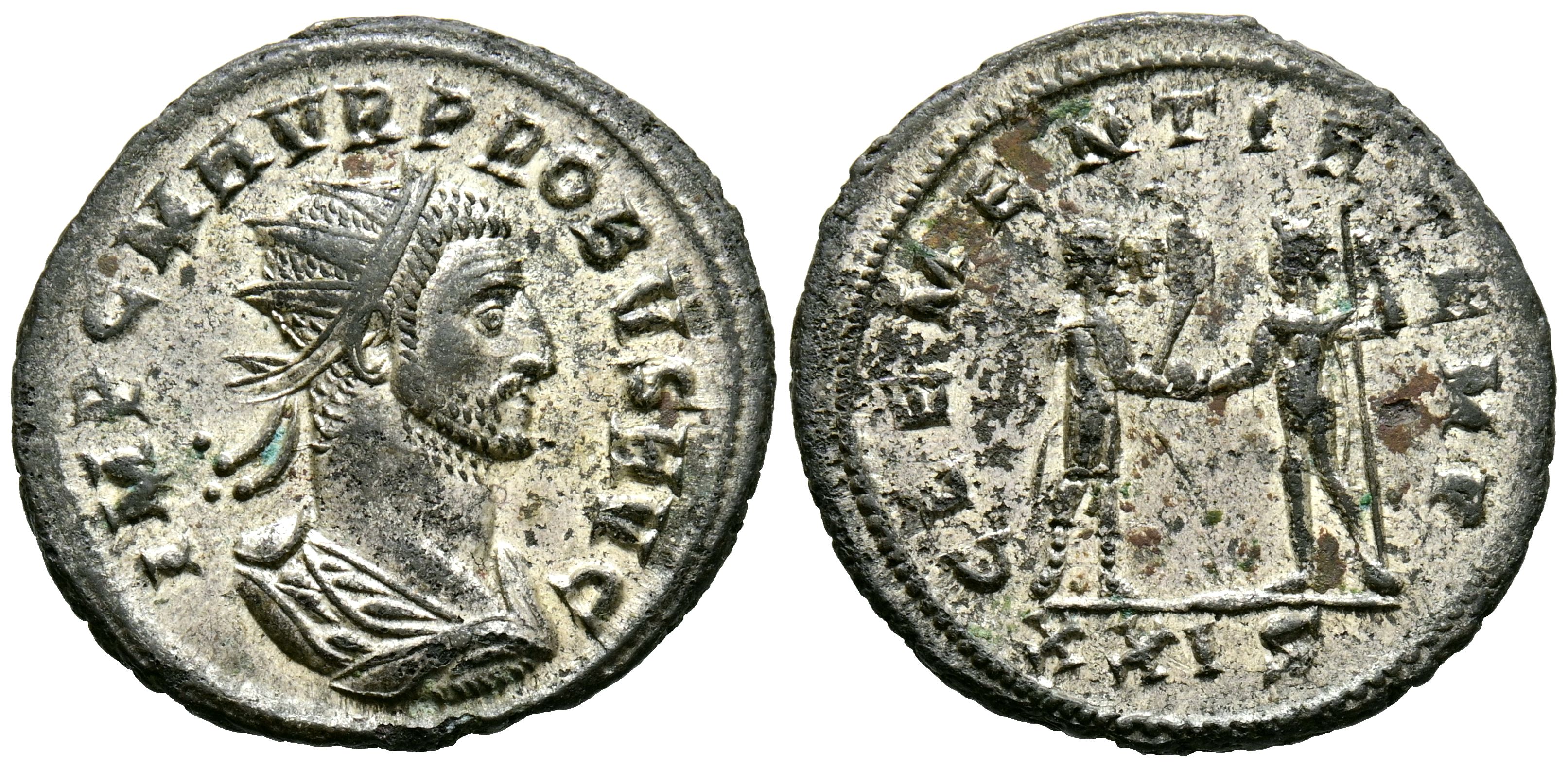 PROBUS. Antoninian. (Ve. 3.54g/23mm). 276-282 AD Antioch. (RIC 922). Anv: Radiated and cuirassed bust of Probus on the right, around legend: IMP CM AVR PROBVS AVG. Rev: Probus standing on the right carrying scepter and receiving Victory from Jupiter standing and left carrying scepter, in exergue: XXIÇ, around legend: CLEMENTIA TEMP. Good Very Fine. Remains of original silver.