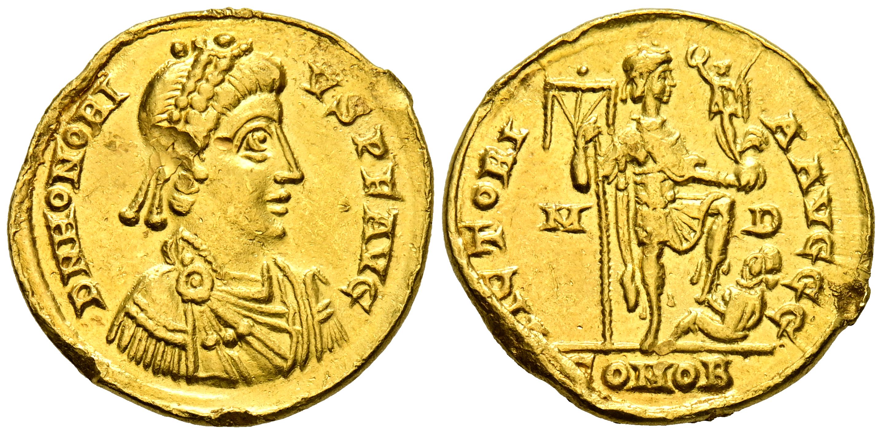 HONORIUS. Solid. (Au. 3.95g/20mm). 394-395 AD Mediolanum. (RIC 1206). Anv: Diademed and cuirassed bust of Honorius on the right, around legend: DN HONORIVS PF AVG. Rev: Honorius standing on the right standing on a captive carrying a standard and Victoria with a laurel wreath on a globe, between: MD, in exergue. CONOB, around legend: VICTORIA AVGGG. Good Very Fine. Blow on obverse.
