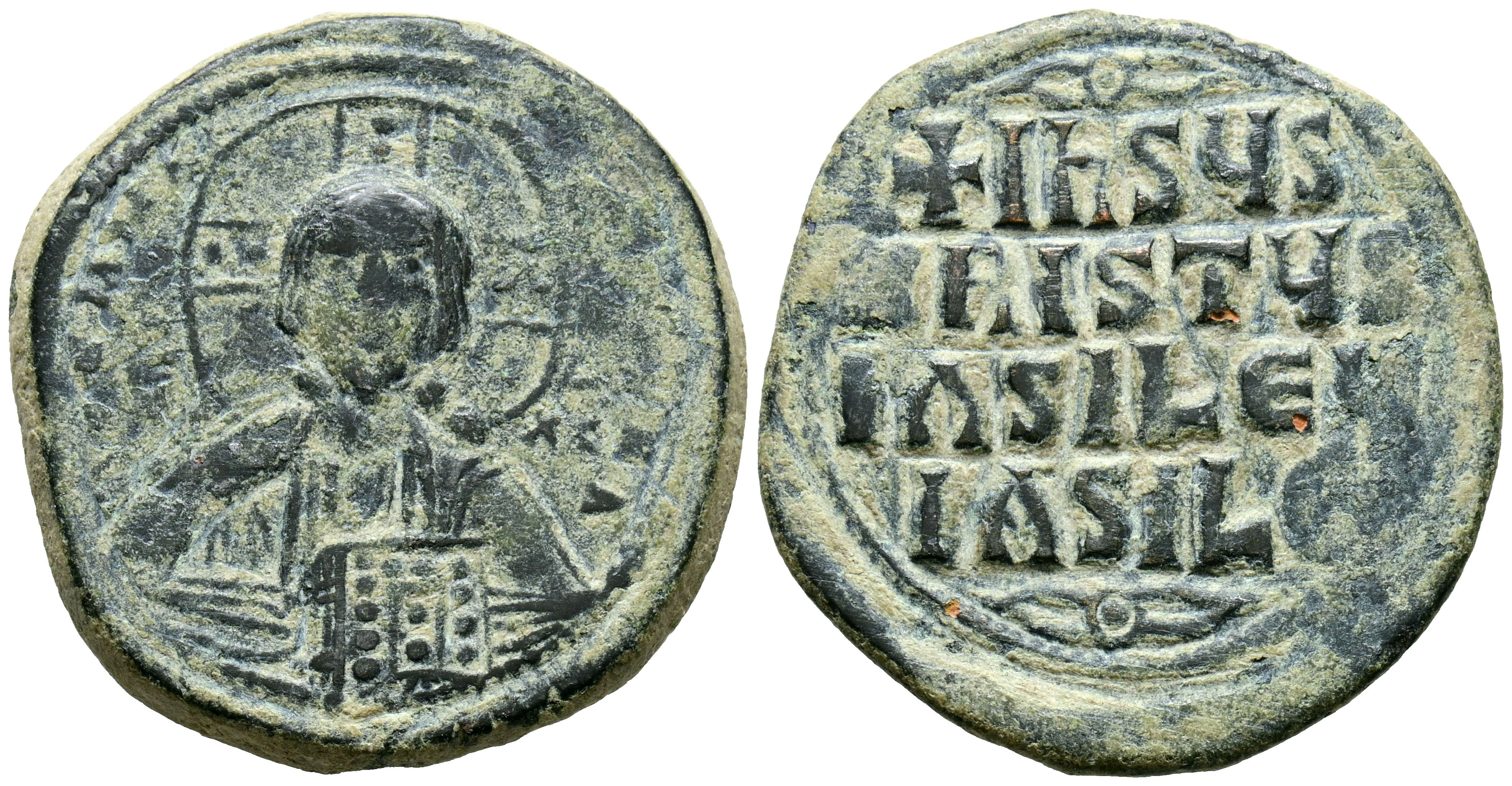 ANONYMOUS, times of Basil II and Constantine VIII. Follis. (Ae. 11.81g/29mm). 976-1025 AD Constantinople. (Seaby 1813). Anv: Christ crowned from the front with a book in his hands, legend around it. Rev: Legend in four lines. Almost Very Fine.