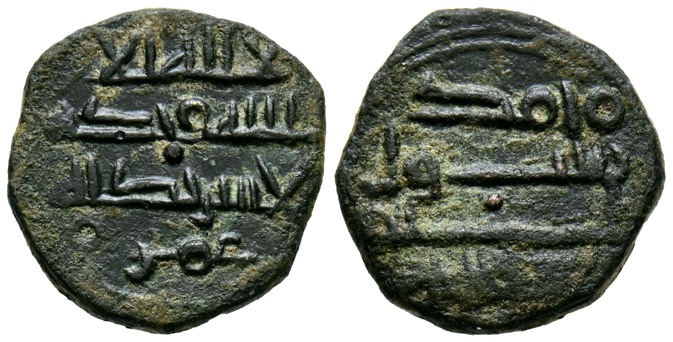 INDEPENDENT EMIRATE OF CÓRDOBA, Attributed to Muhammad I. Felus. (Ae. 2.09g/14mm). No date or mint. Quoting 'Umar/عمر in IA. and 'Abd al-Rahman/عبد الرحمن in IIA. (Vives 322; R. Frochoso 2001 I-65). Very Fine. Strange.