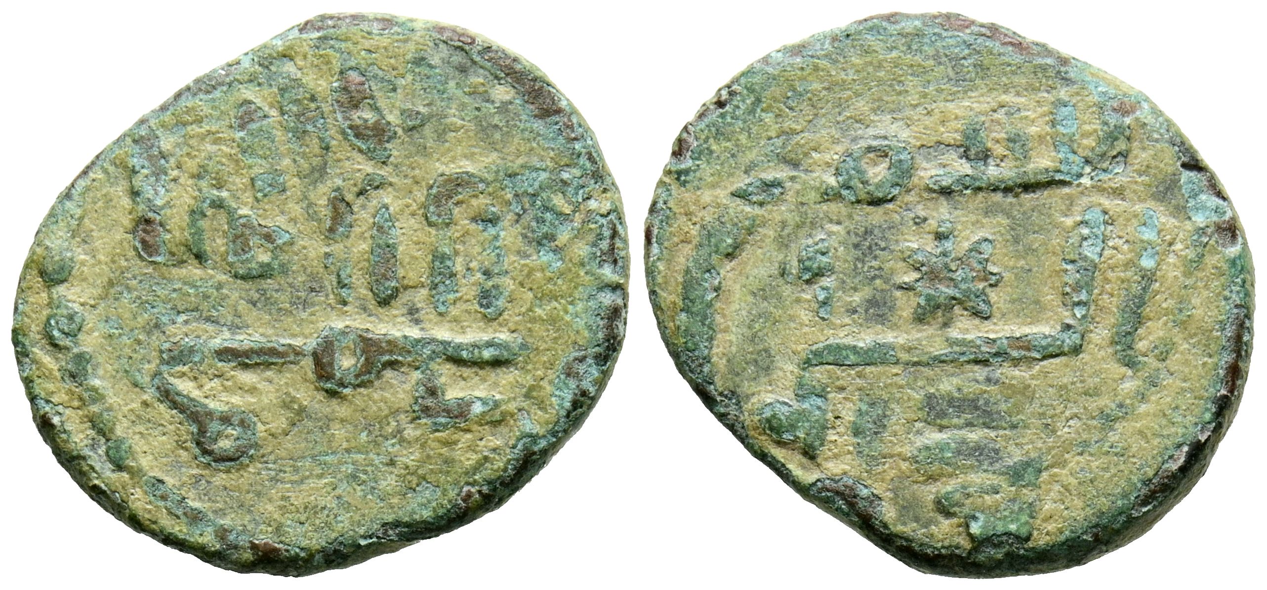 English DEPENDENT EMIRATE OF CÓRDOBA, Period of Governors. Anonymous. Felus. (Ae. 3.06g/17mm). It only contains religious legend. (Frochoso 2001. IX-a). (Double coinage in IIA). Very pretty blue-green patina. Very Fine.