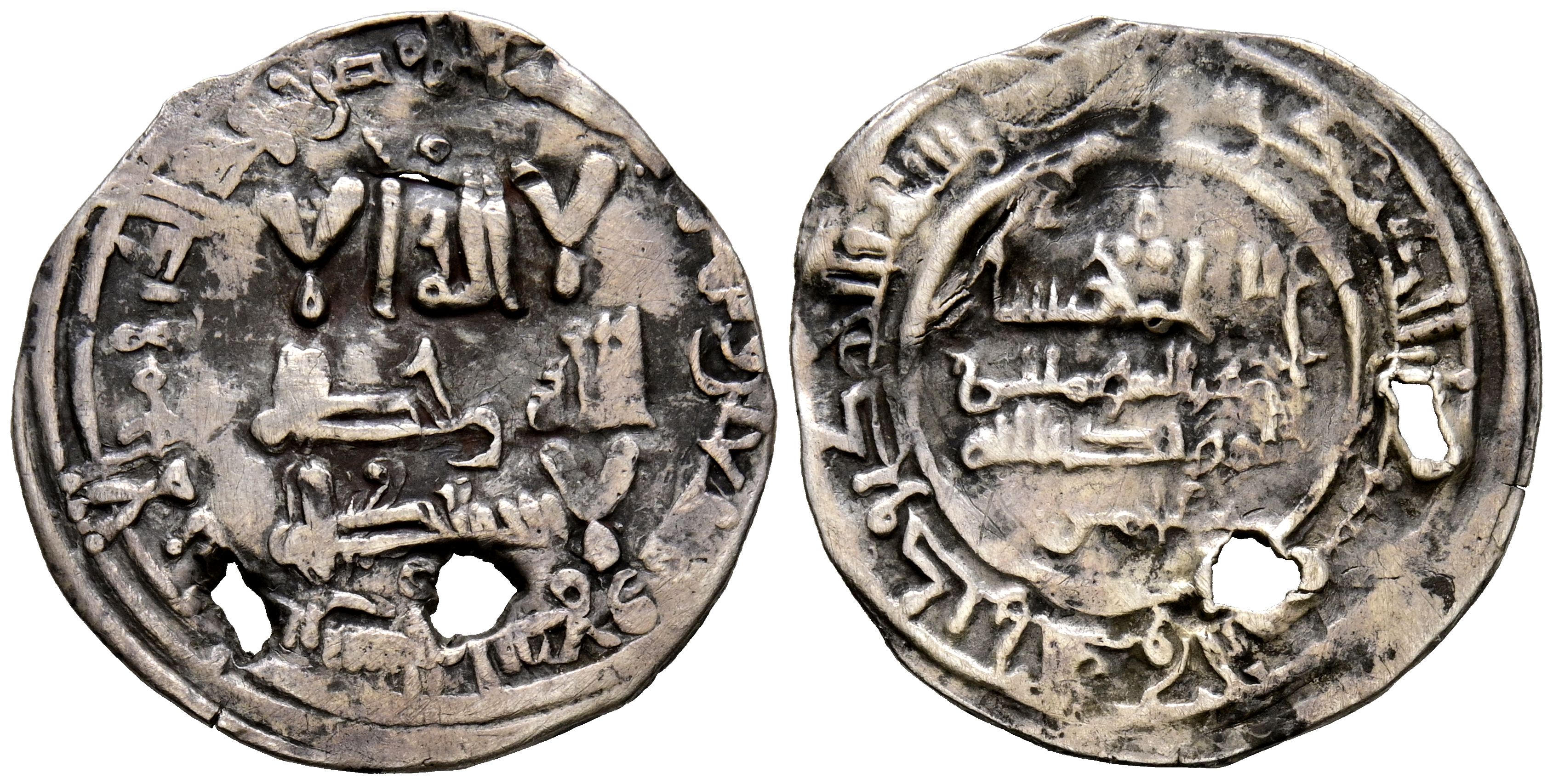 CALIPHATE OF CÓRDOBA, Hisam II. Dirham. (Ar. 2.23g/24mm). 379H. al-Andalus / الاندلس. Quoting 'Amir in IA. (Vives 510; R. Frochoso 2009 379.23). Almost Very Fine. Two holes and a crack on the first line.