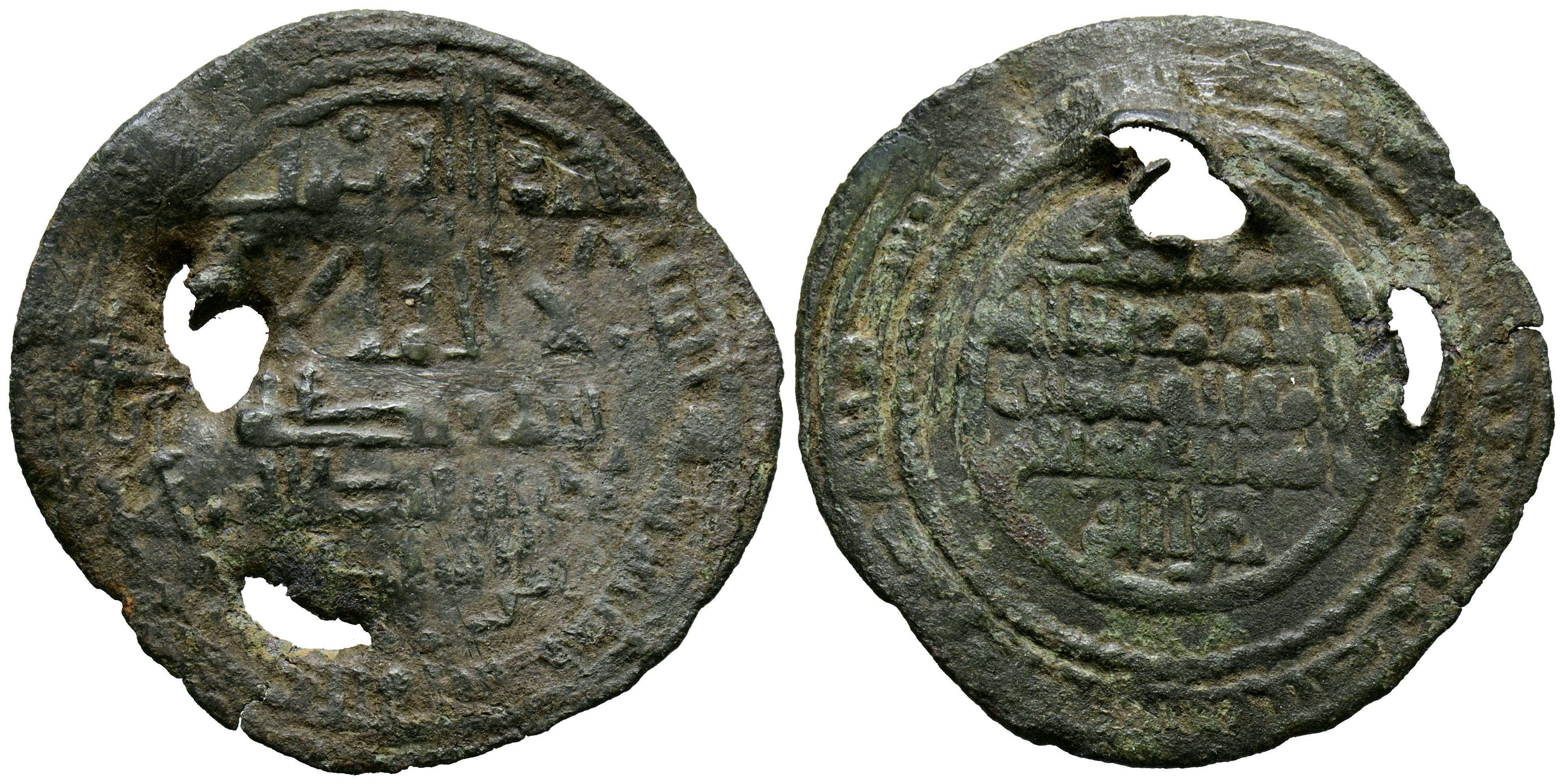KINGDOMS OF TAIFAS. TAIFA OF SEVILLE, al-Mu'tamid 'Alà Aallah Abu-l-Qasim Muhammad B. 'Abbad. Dirham. (Ve. 2.03g/28mm). 472H. Medina Zahara. (Vives 961). Good Fine. Limited. Two perforations.