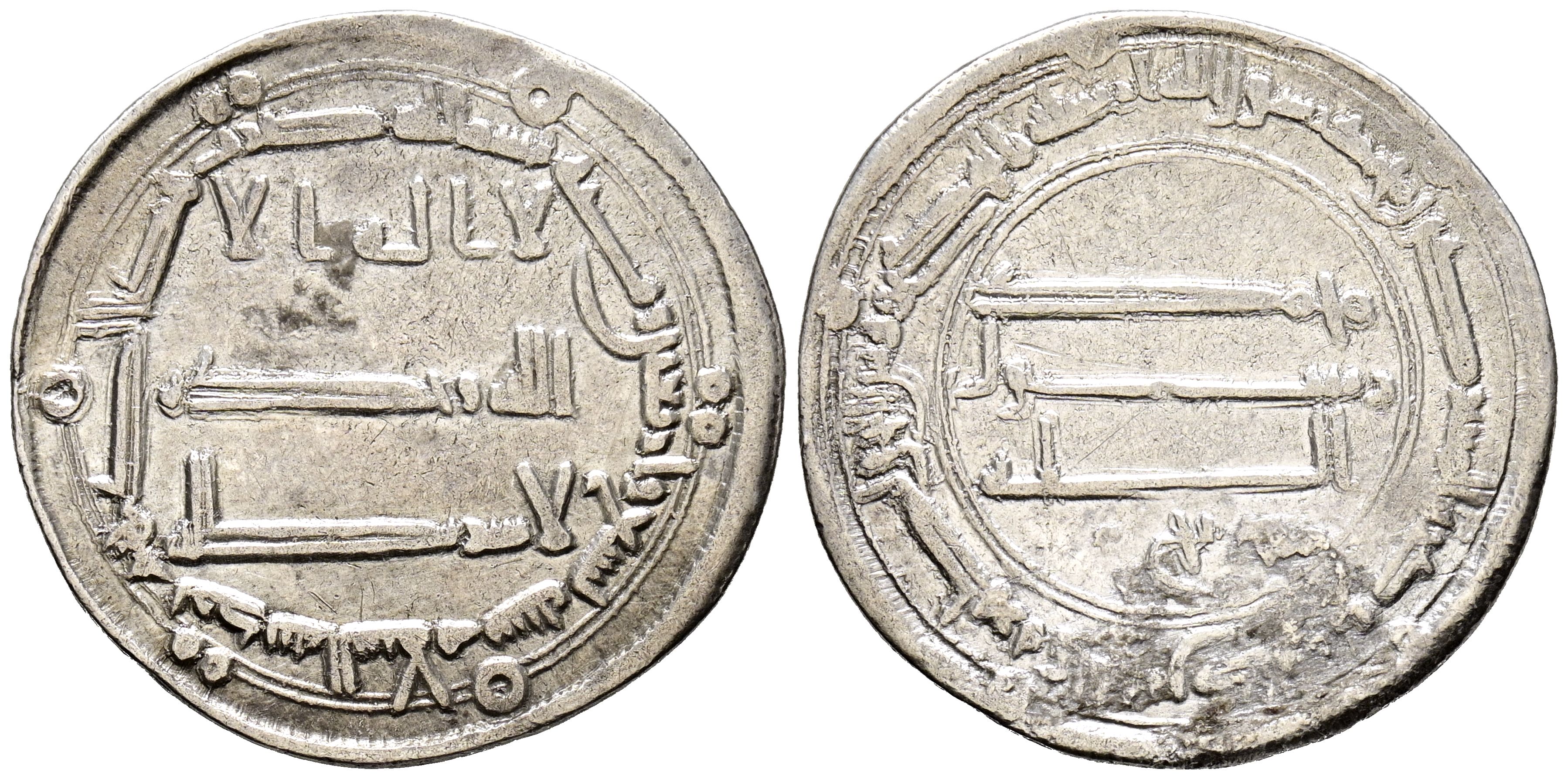 ABBASI CALIPHATE. Abd Allah al-Mansur. Dirham. (Ar. 2.73g/25mm). 149H. Medina al-Salam. (Nutzel-661; SICA 3-1561). Very Fine. Concretions.