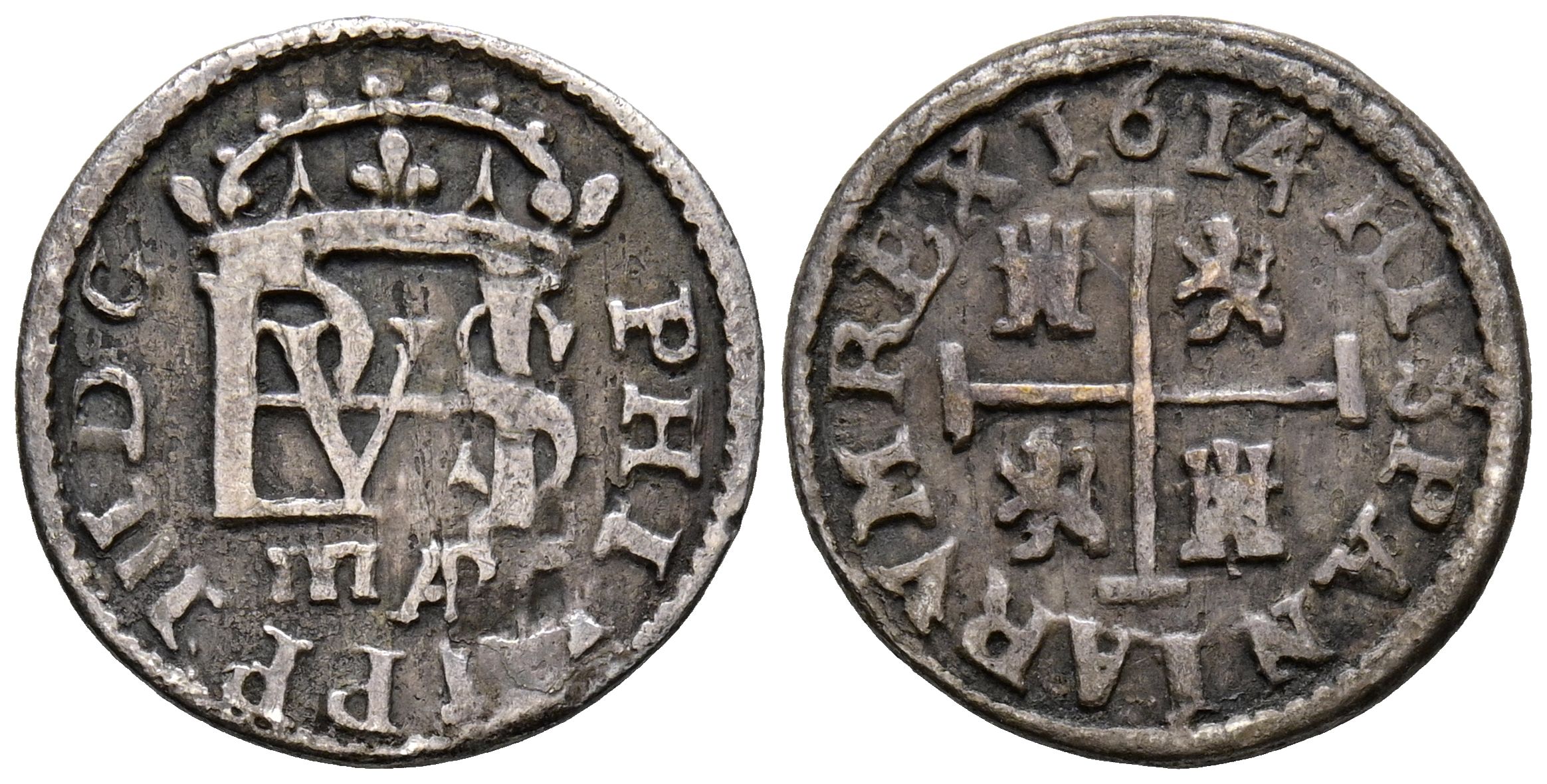 PHILIP III (1598-1621). 1/2 Real (Ar. 1.20g/16mm). 1614/3. Segovia AR. (Cal-2019-425). Almost Very Fine. Strange.