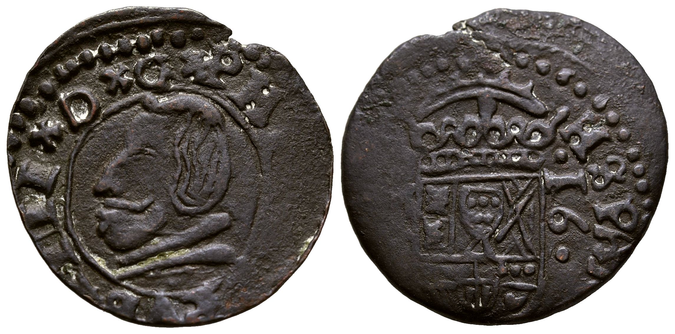 PHILIP IV (1621-1665). 16 Maravedis. (Ae. 3.82g/25mm). Date not visible. It is probably the Madrid mint based on its bust. Period fake. Good Very Fine. Scarce specimen with the bust on the left.