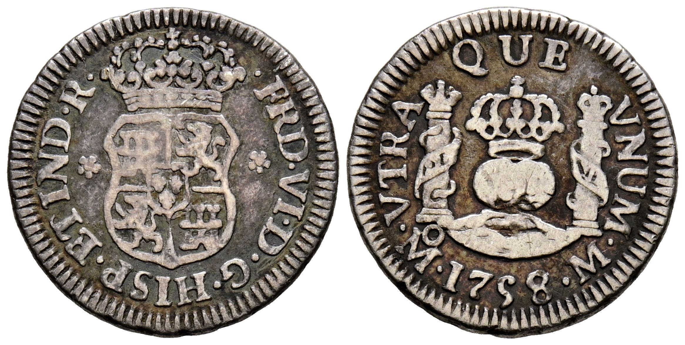 English FERDINAND VI (1746-1759). 1/2 Real. (Ar. 1.65g/16mm). 1758. México M. (Cal-2019-97). real and imperial crowns on columns. Almost Very Fine/ Very Fine.