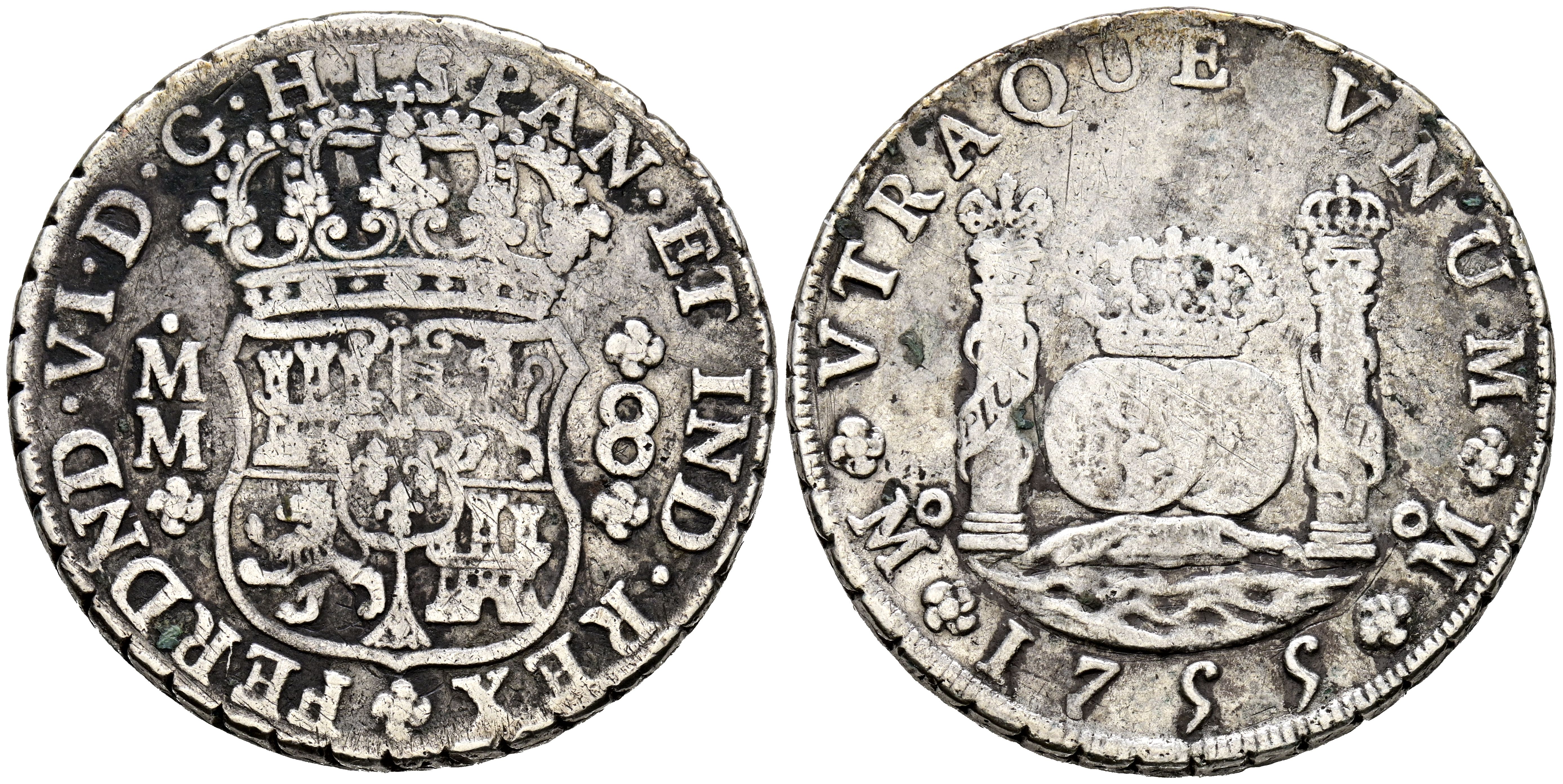 FERDINAND VI (1746-1759). 8 Reales. (Ar. 26.26g/39mm). 1755. Mexico MM. (Cal-2019-489). Good Fine. Cleaned.