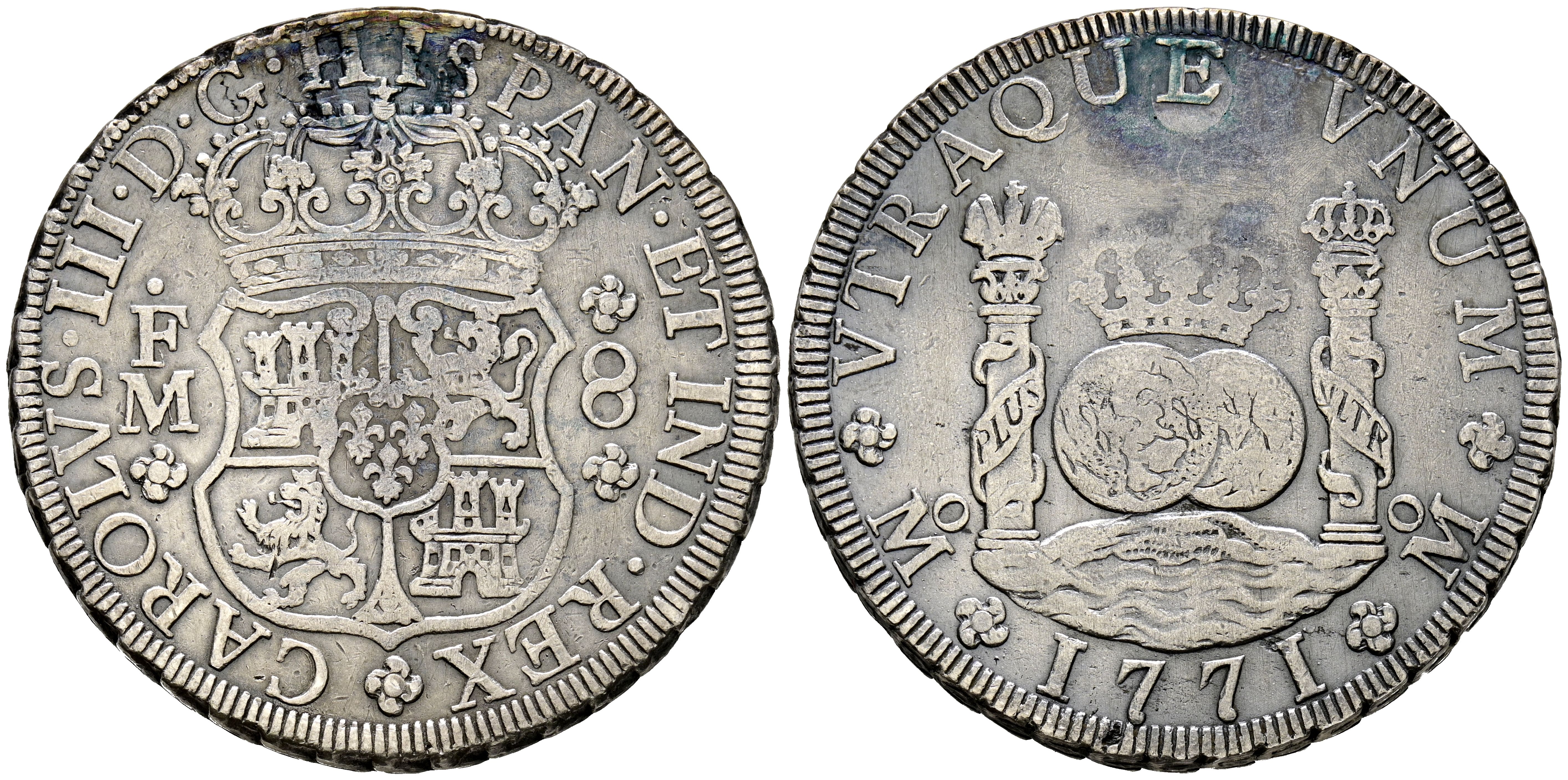 English CARLOS III (1759-1788). 8 Reales. (Ar. 26.75g/40mm). 1771. Mexico MF. (Cal-2019-1103). Very Fine. Hole plugged at 12 o'clock.