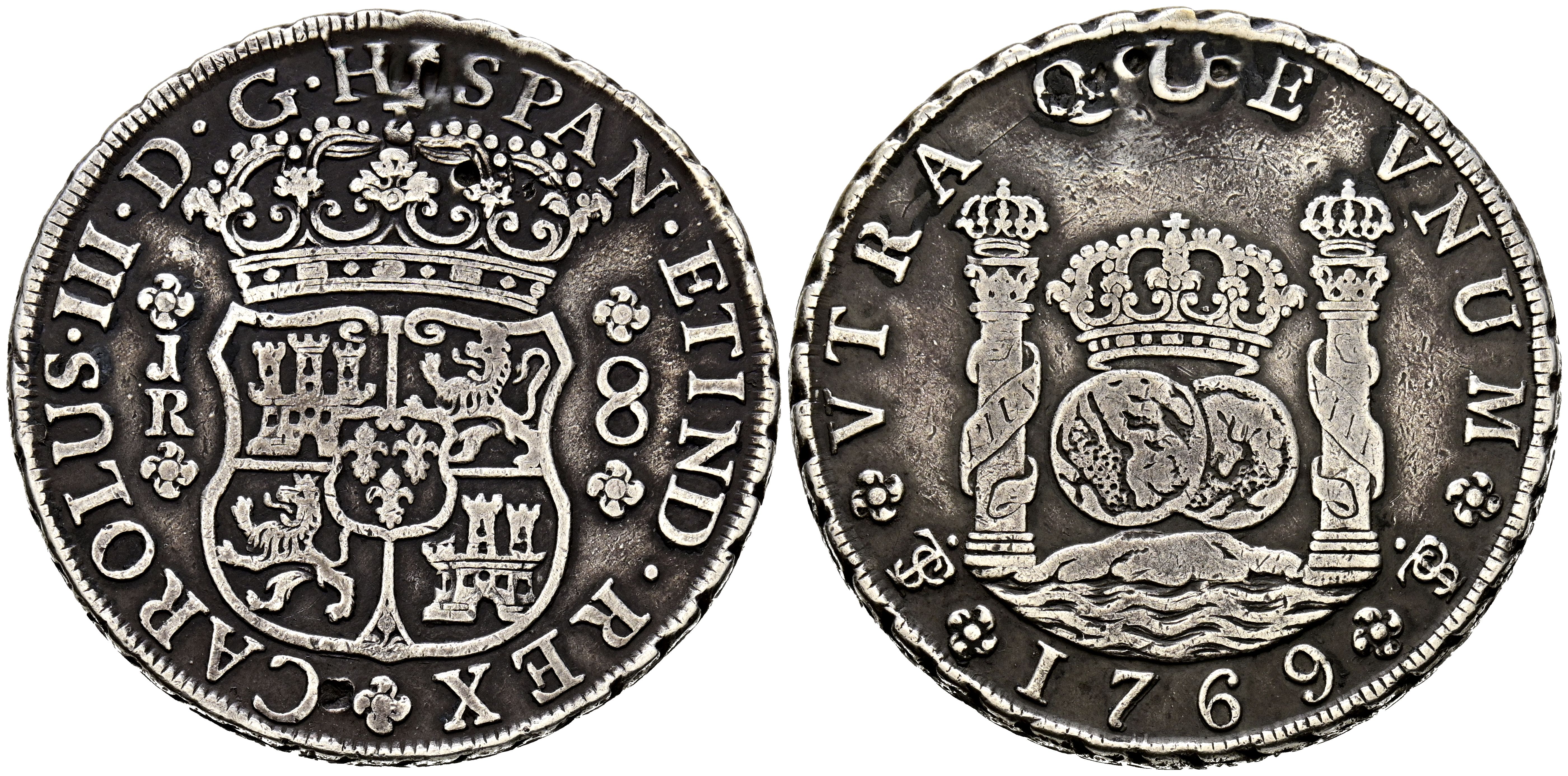 CARLOS III (1759-1788). 8 Reales. (Ar. 26.72g/39mm). 1769. Potosí JR. (Cal-2019-1165). 9 curved. Almost Very Fine. Hole plugged at 12 o'clock.