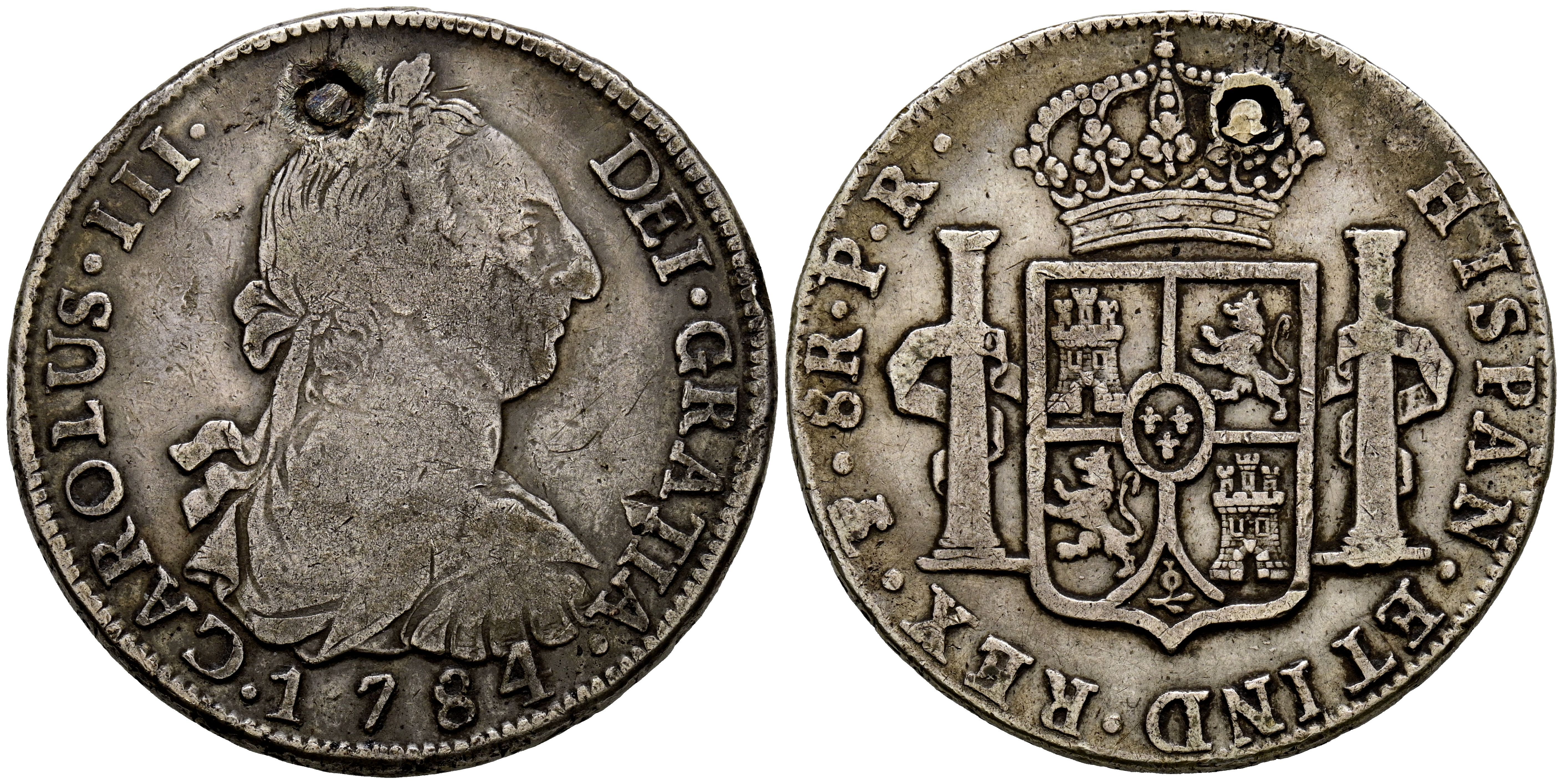 CARLOS III (1759-1788). 8 Reales. (Ar. 26.55g/39mm). 1784. Potosí PR. (Cal-2019-1187). Fine Plugged hole.