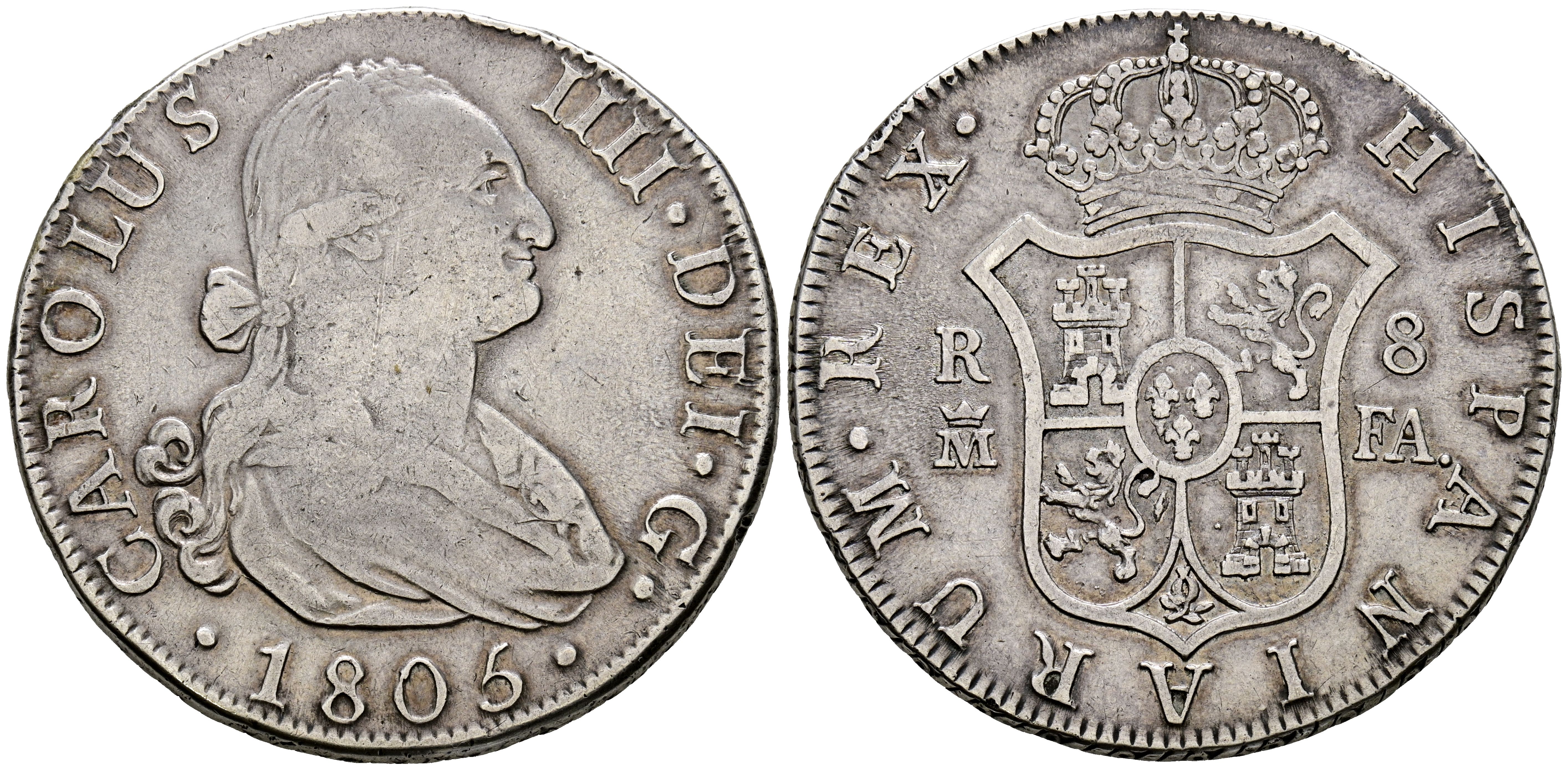 CARLOS IV (1788-1808). 8 Reales. (Ar. 26.88g/39mm). 1805. Madrid FA. (Cal-2019-943). Almost Very Fine.