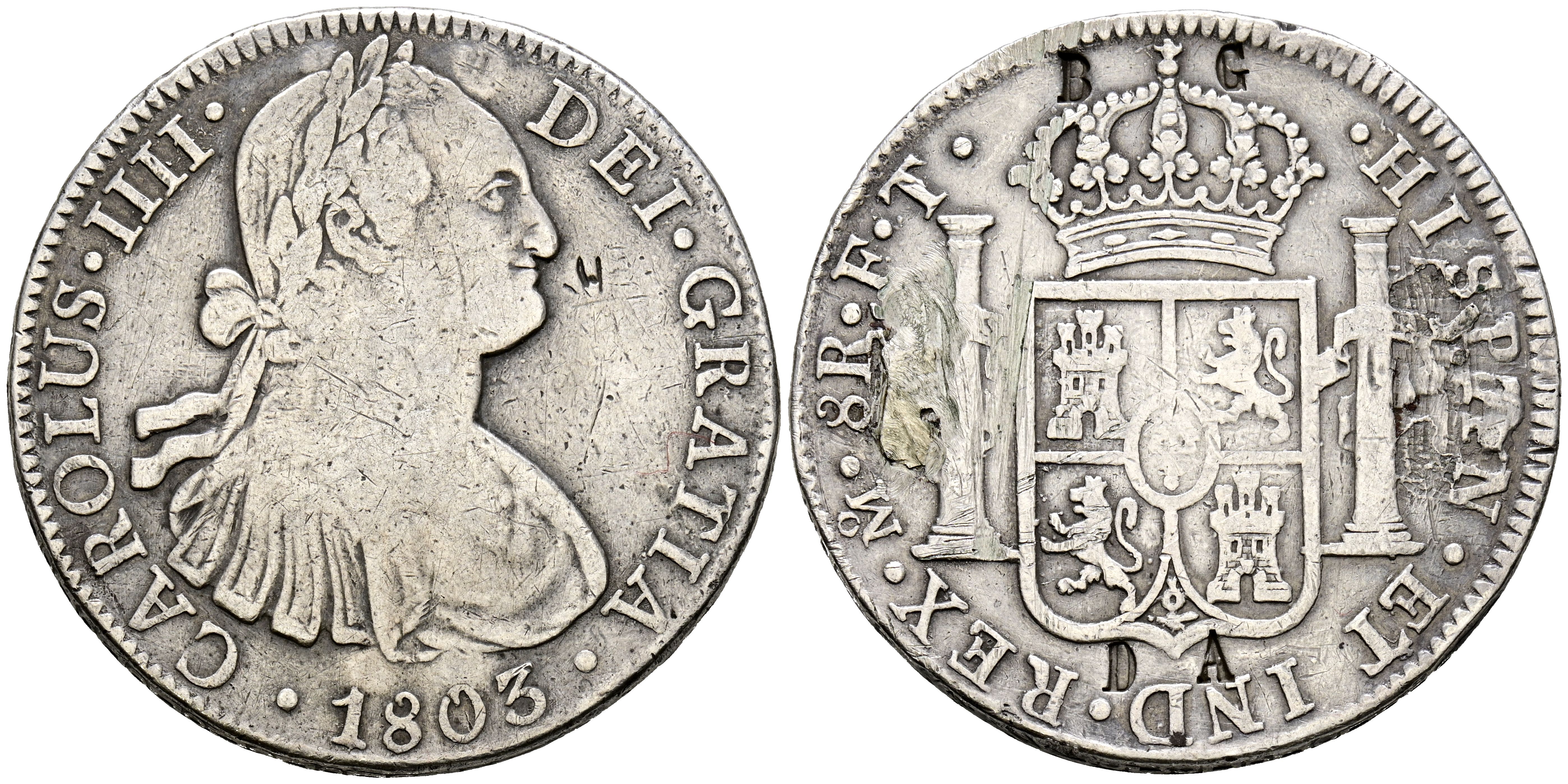 CARLOS IV (1788-1808). 8 Reales. (Ar. 26.74g/40mm). 1803. Mexico FT. (Cal-2019-977). Fine Initials and brands. Welding remains.