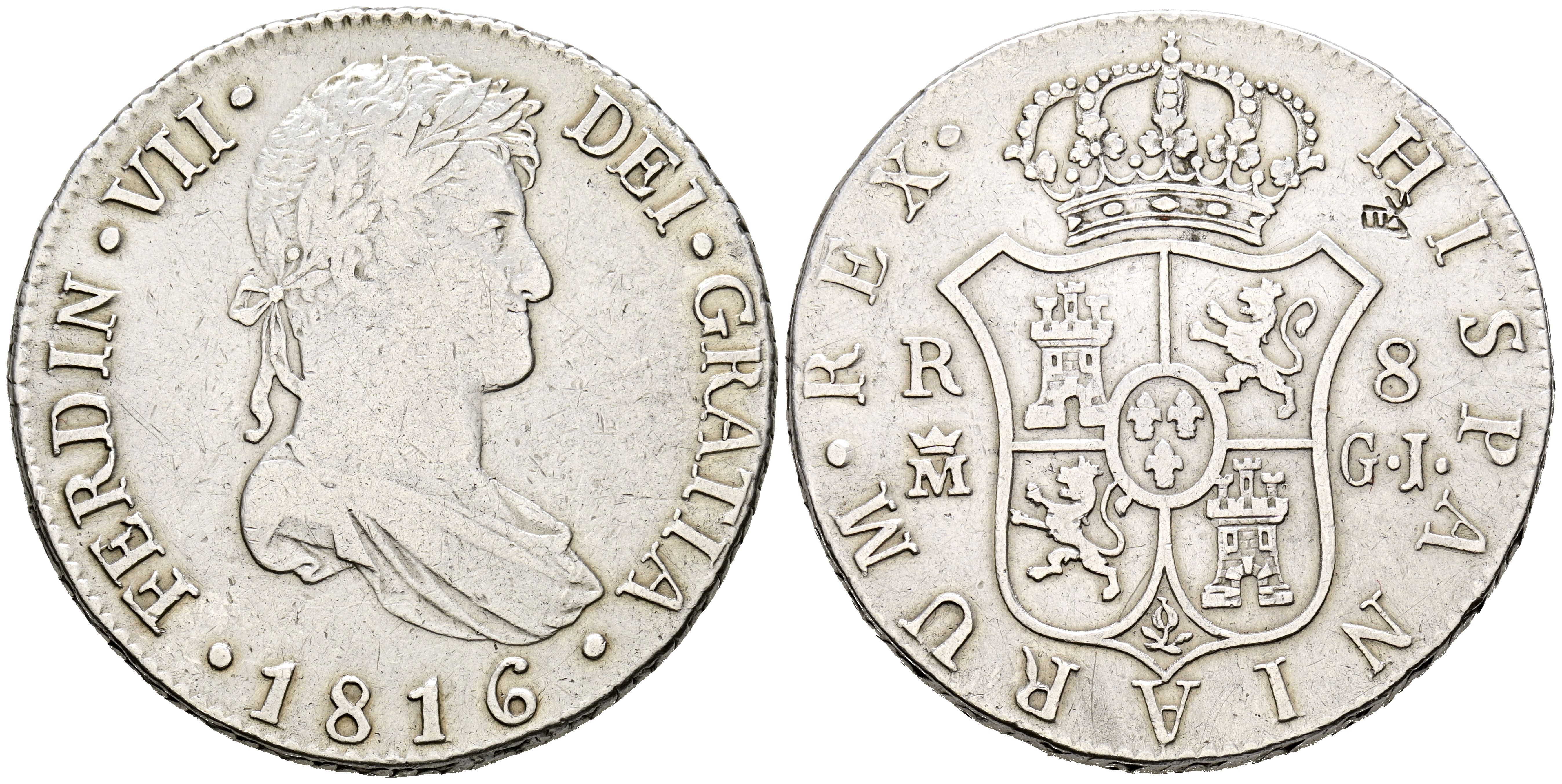 FERNANDO VII (1808-1833). 8 Reales. (Ar. 27,00g/39mm). 1816. Madrid GJ. (Cal-2019-1270). Busto laureado. MBC. Resello en reverso.