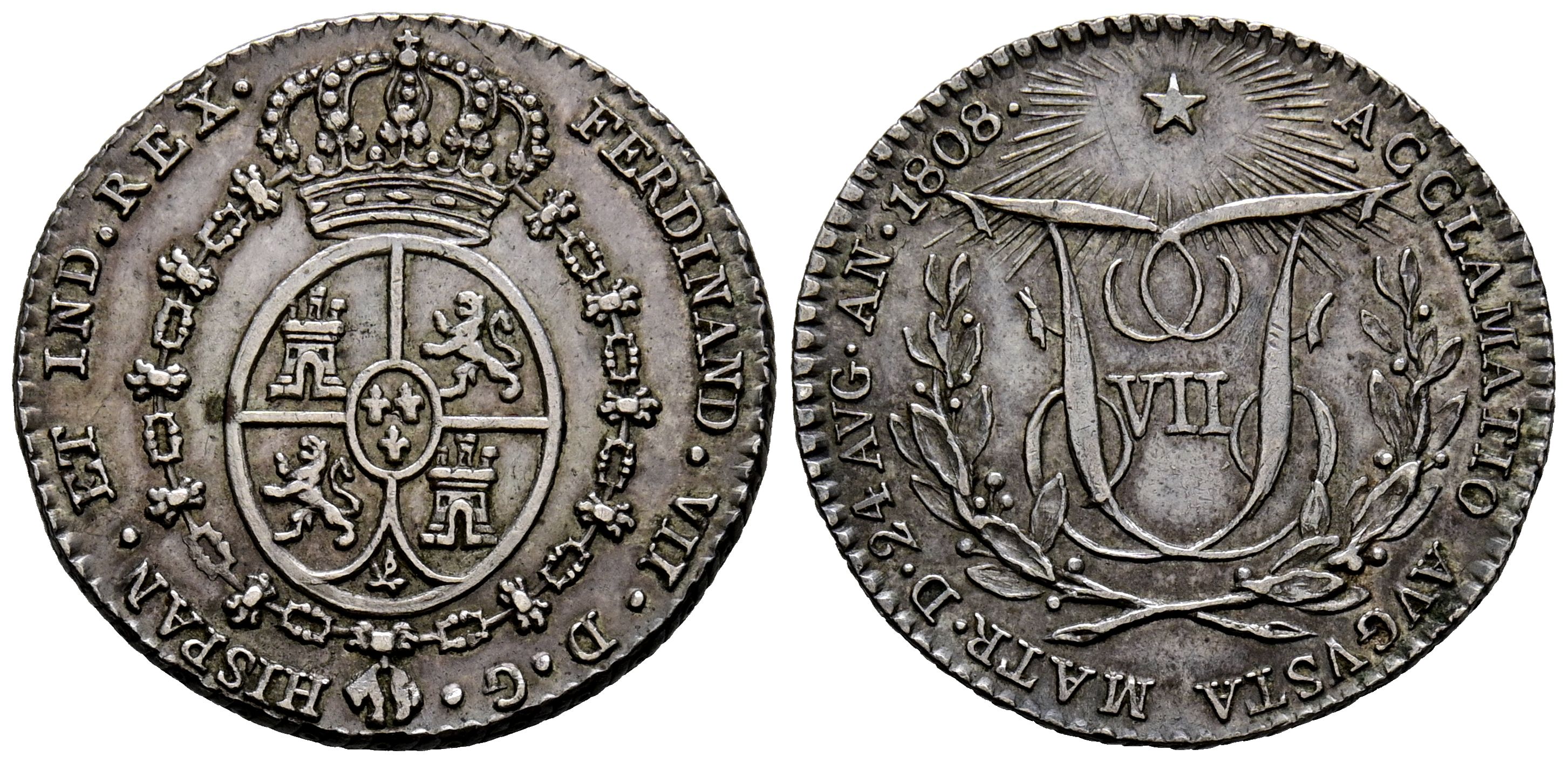 English FERDINAND VII (1808-1833). Proclamation in Madrid (Ar. 3.03g/20mm). 1808. Module of 1 Real. (Ha. 3). Almost Extremely Fine. Beautiful patina.