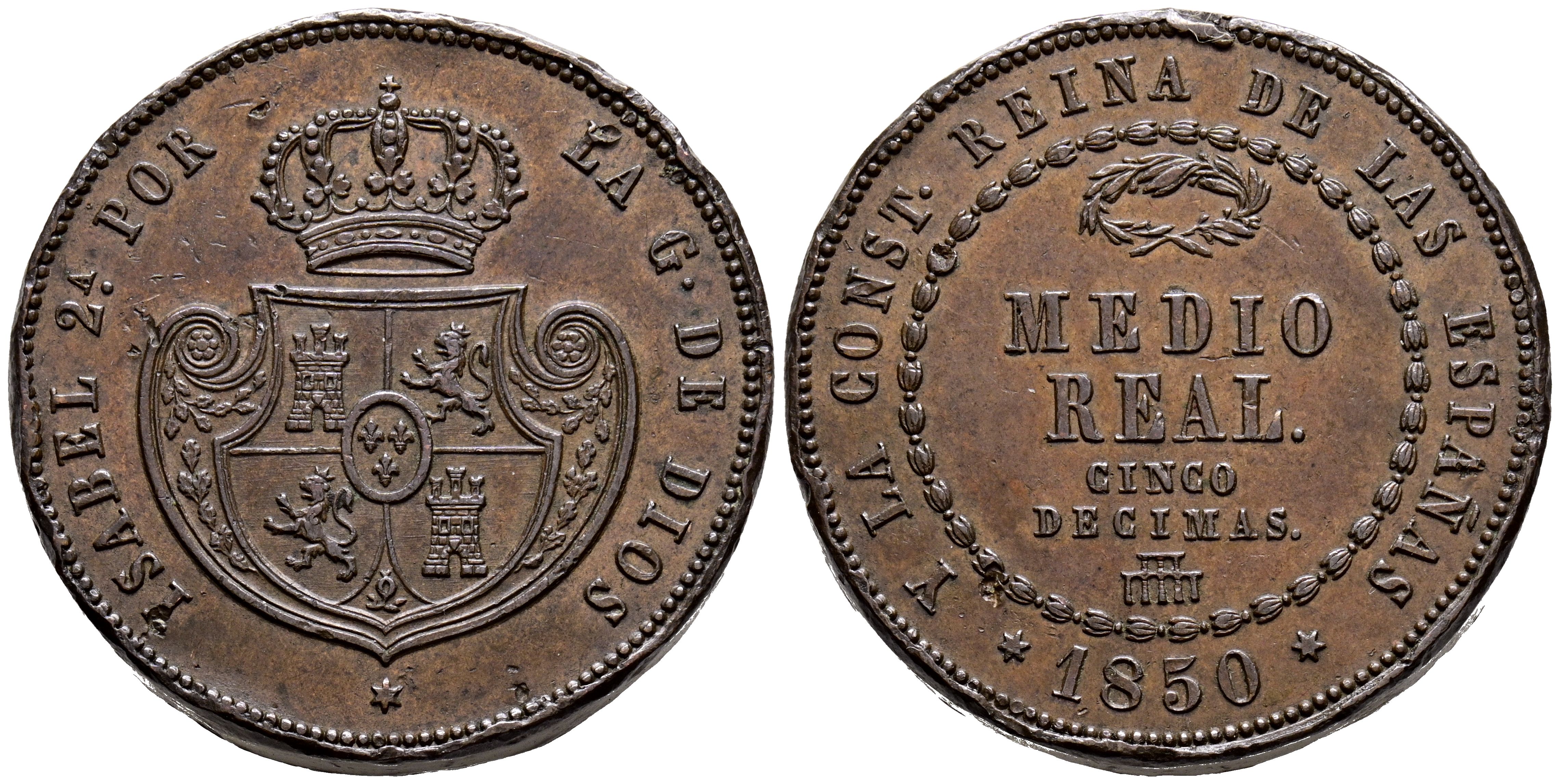 ELIZABETH II (1833-1868). 1/2 Real (5 Tenths). (Ae. 19.79g/32mm). 1850. Segovia. (Cal-2019-155). Good Very Fine. Taps on listel.