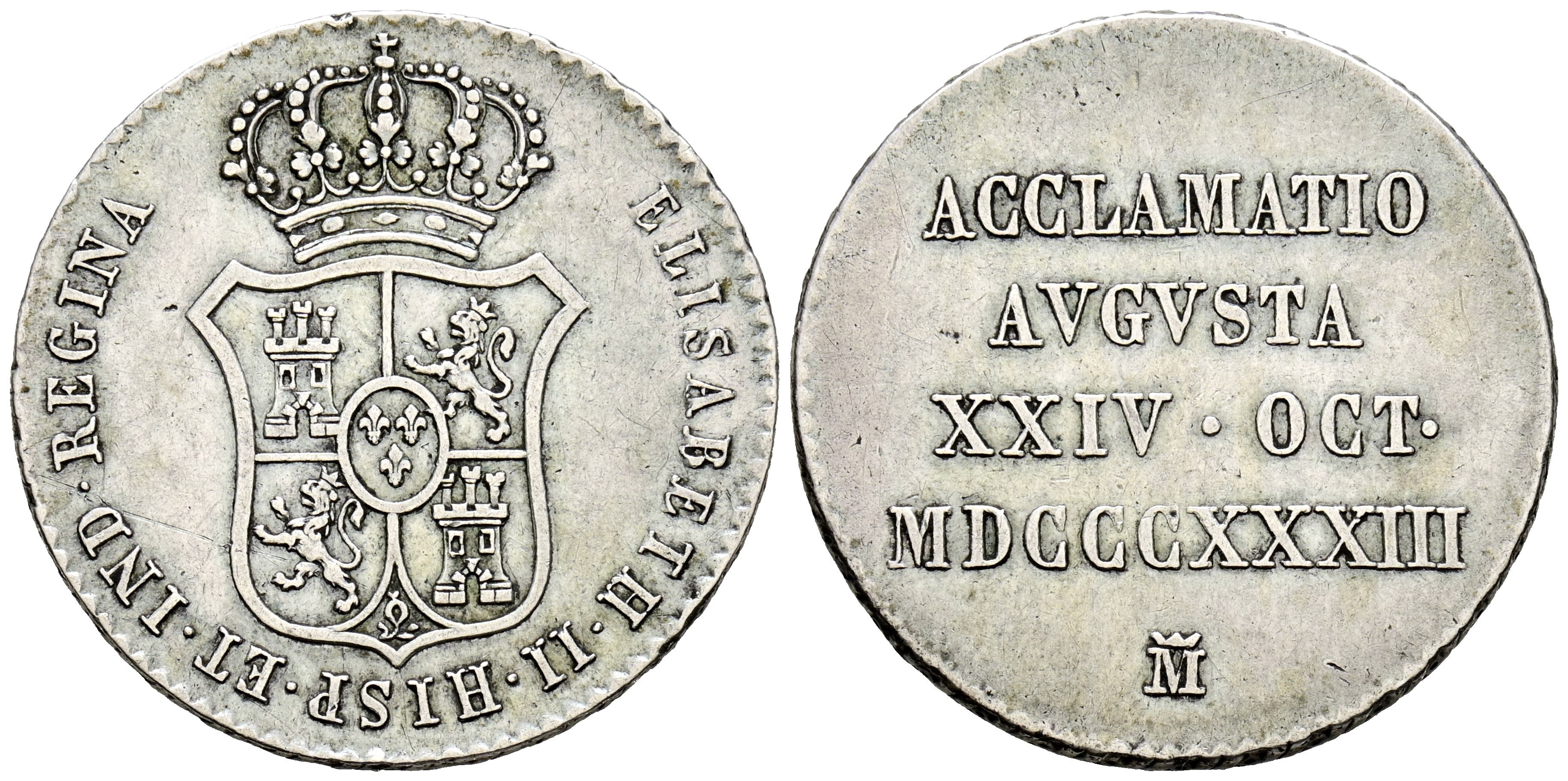 ISABEL II (1833-1868). Proclamación en Madrid (Ar. 5,92g/26mm). 24 de Octubre de 1833. Módulo de 2 Reales. (V. 749). MBC+.
