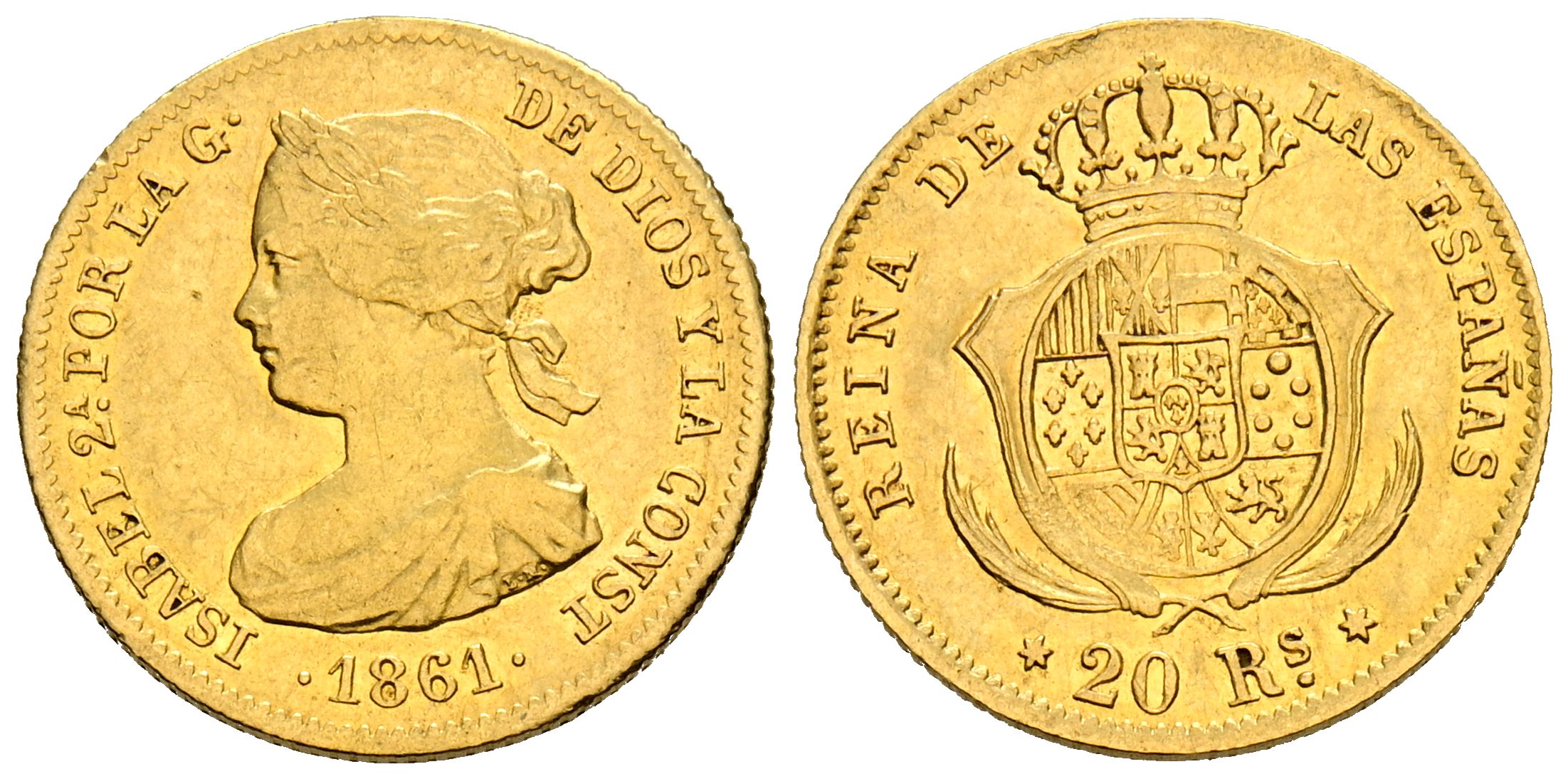 ISABEL II (1833-1868). 20 Reales (Au. 1,68g/15mm). 1861. Madrid. (Cal-2019-672). MBC.