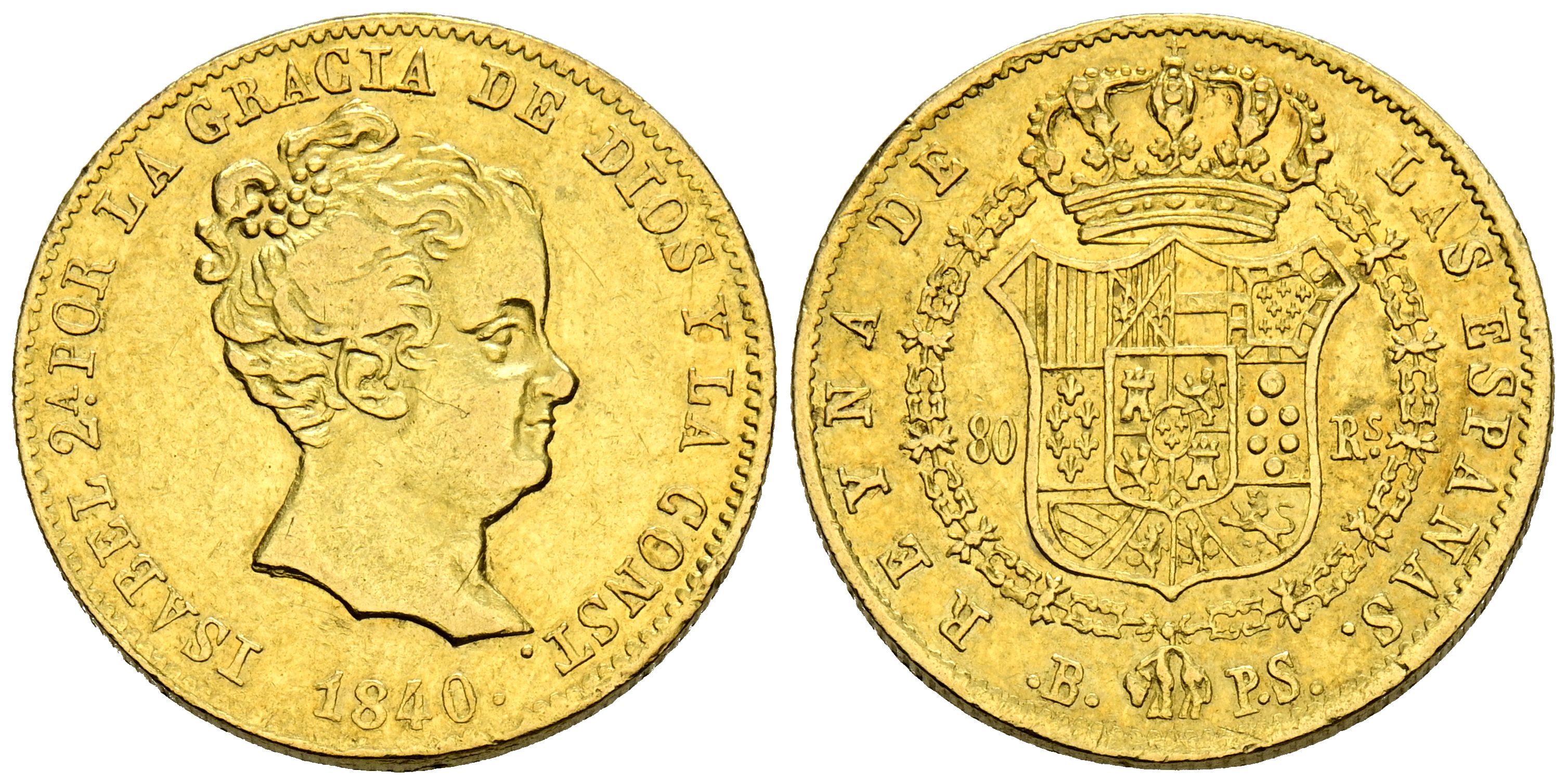 ISABEL II (1833-1868). 80 Reales. (Au 6,74g/ 21mm). 1840. Barcelona PS. (Cal-2019-705). MBC.