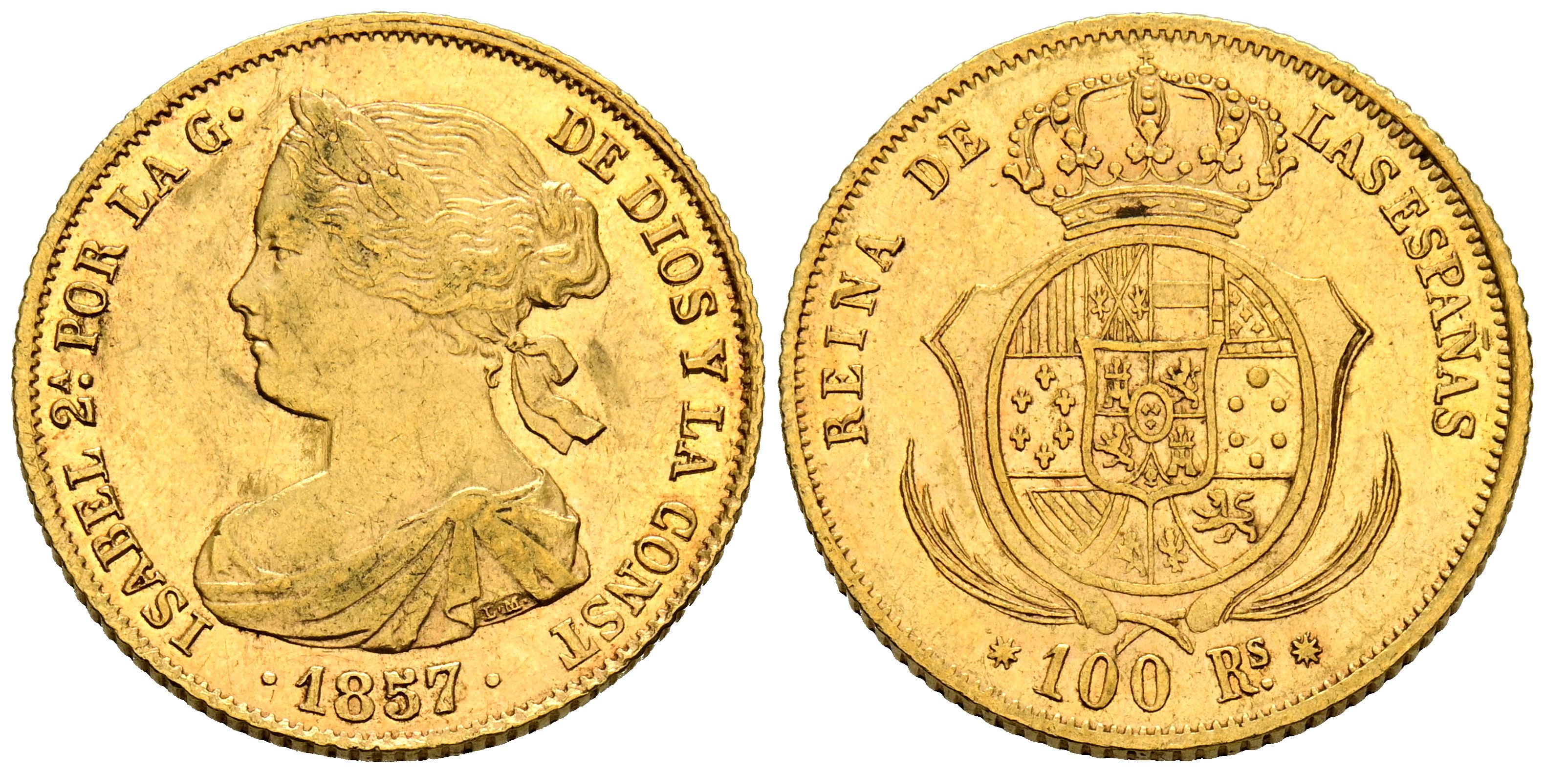 ISABEL II (1833-1868). 100 Reales. (Au. 8,38g/22mm). 1857. Barcelona. (Cal-2019-767). MBC+.