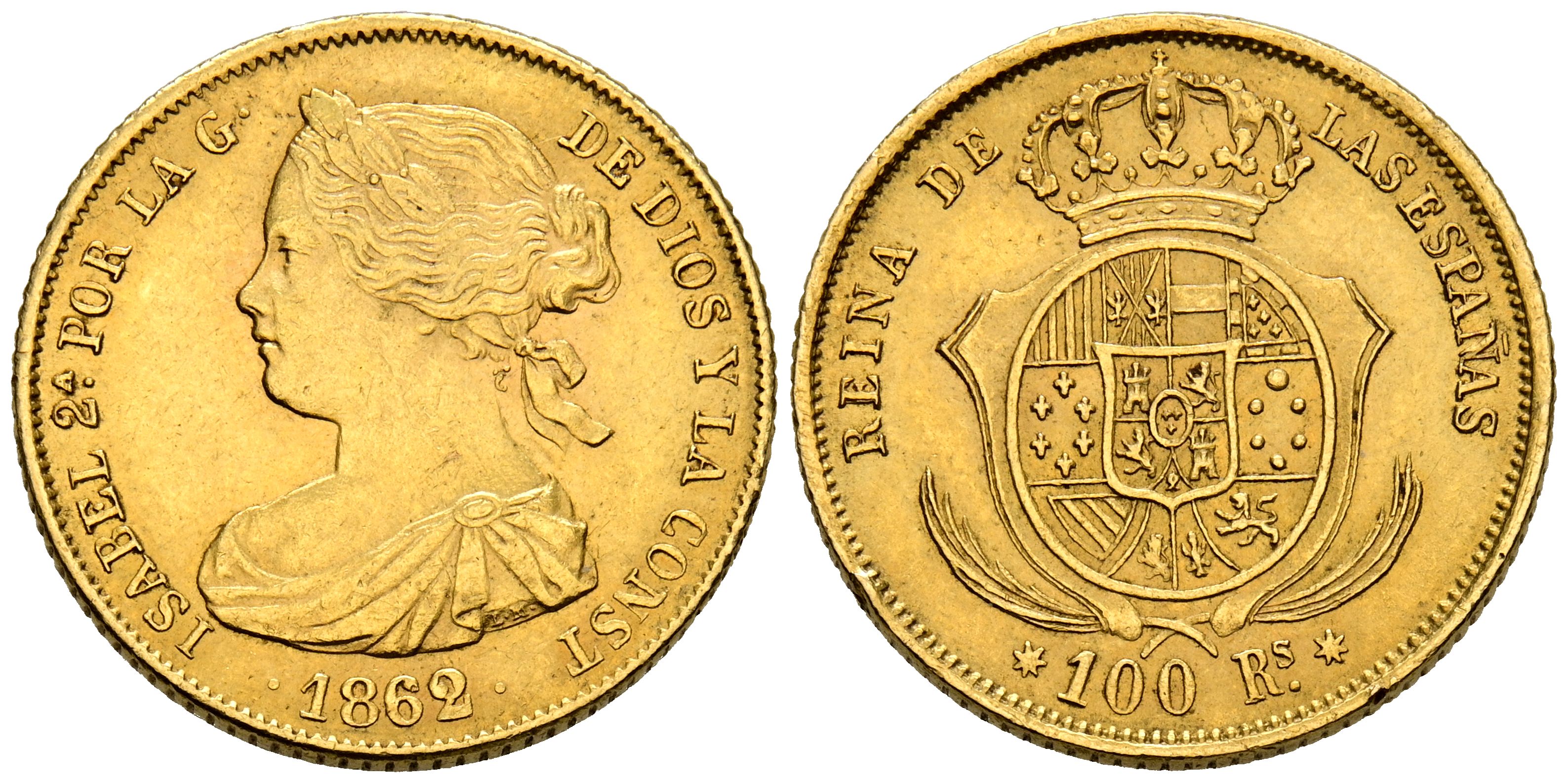 ELIZABETH II (1833-1868). 100 Reales. (Au. 8.44g/22mm). 1862. Sevilla. (Cal-2019-805). Good Very Fine.