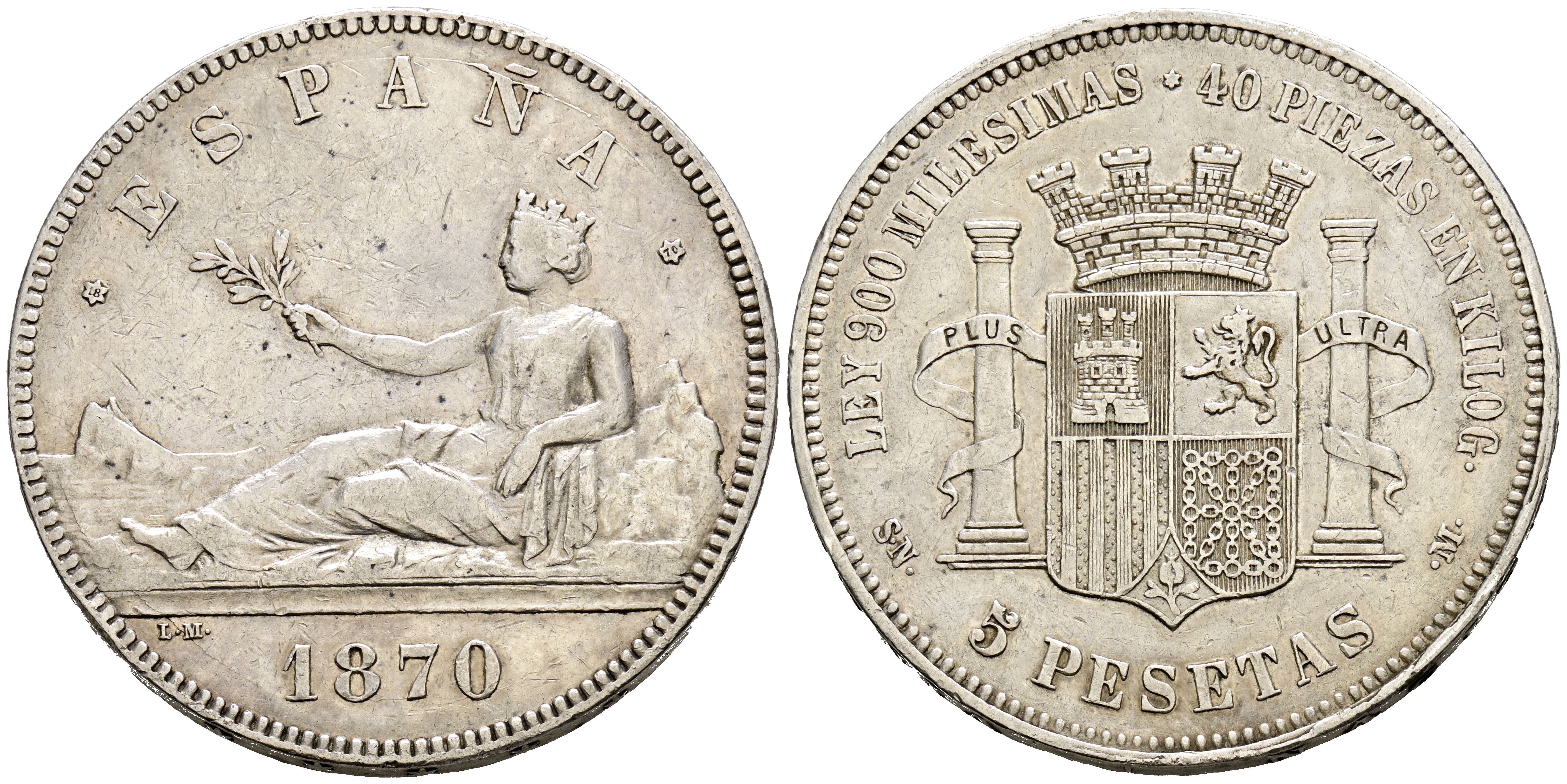 PROVISIONAL GOVERNMENT (1868-1871). 5 Pesetas. (Ar. 24.74g / 37mm). 1870 *18-70. Madrid SNM. (Cal-2019-39). Very Fine.