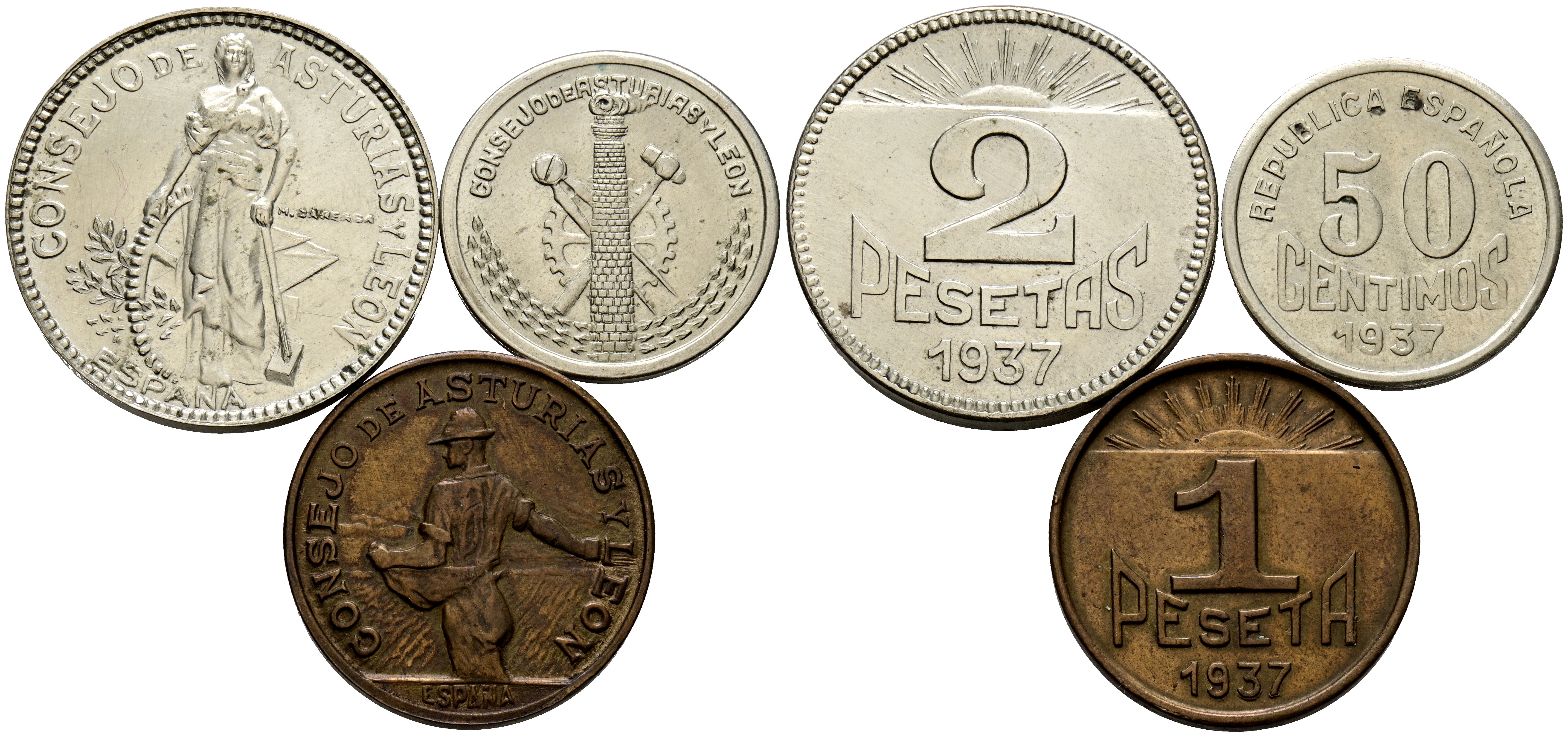 CONSEJO DE ASTURIAS Y LEÓN. Serie completa de tres valores: 50 Céntimos, 1 y 2 Pesetas. 1937. Diferentes estados de conservación. A EXAMINAR.