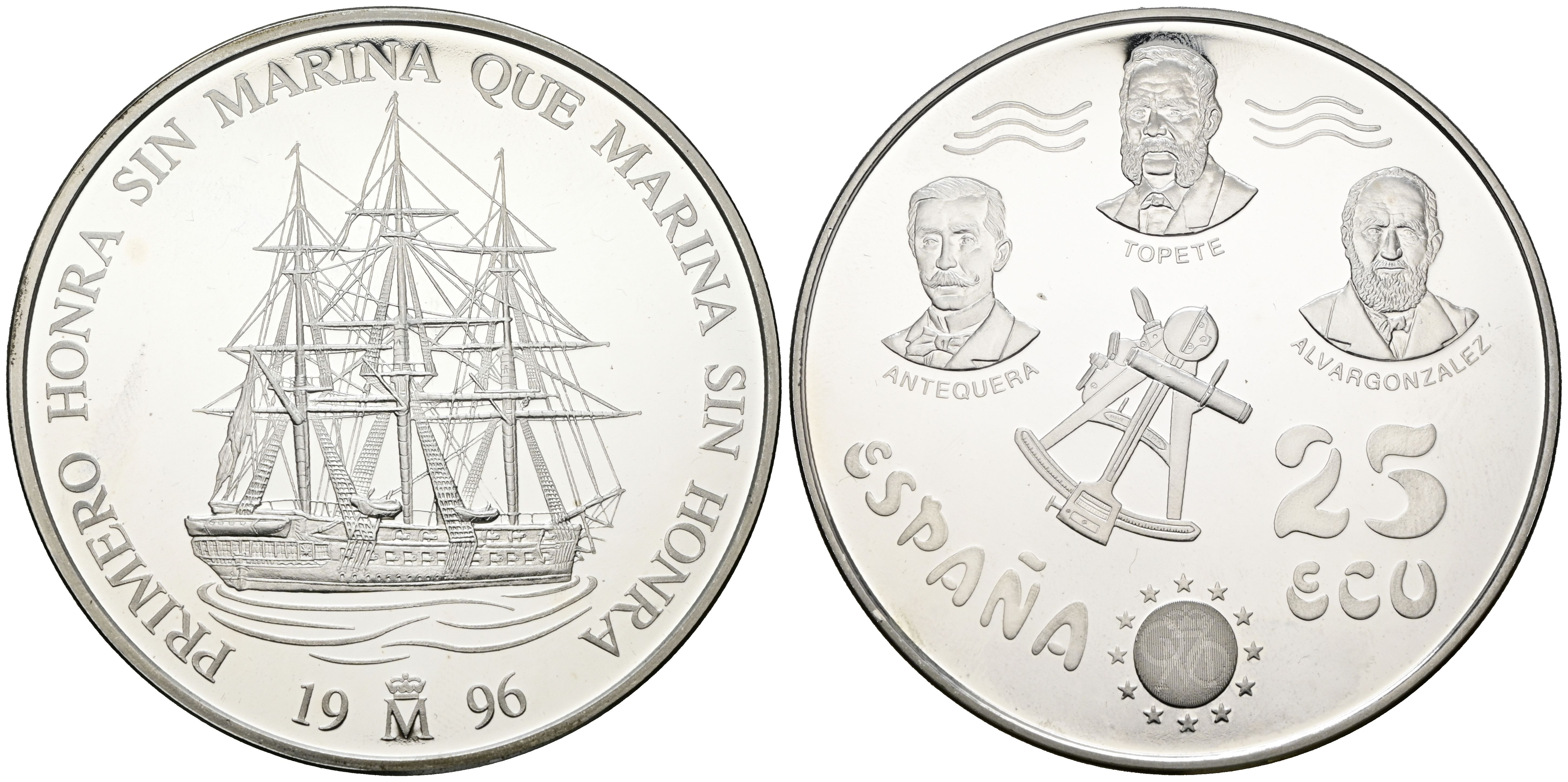 JUAN CARLOS I. 25 Ecu. (Ar. 169,40g/73mm). 1996. Serie de la Marina Española. Villa de Madrid. FNMT. PROOF. Incluye cápsula.