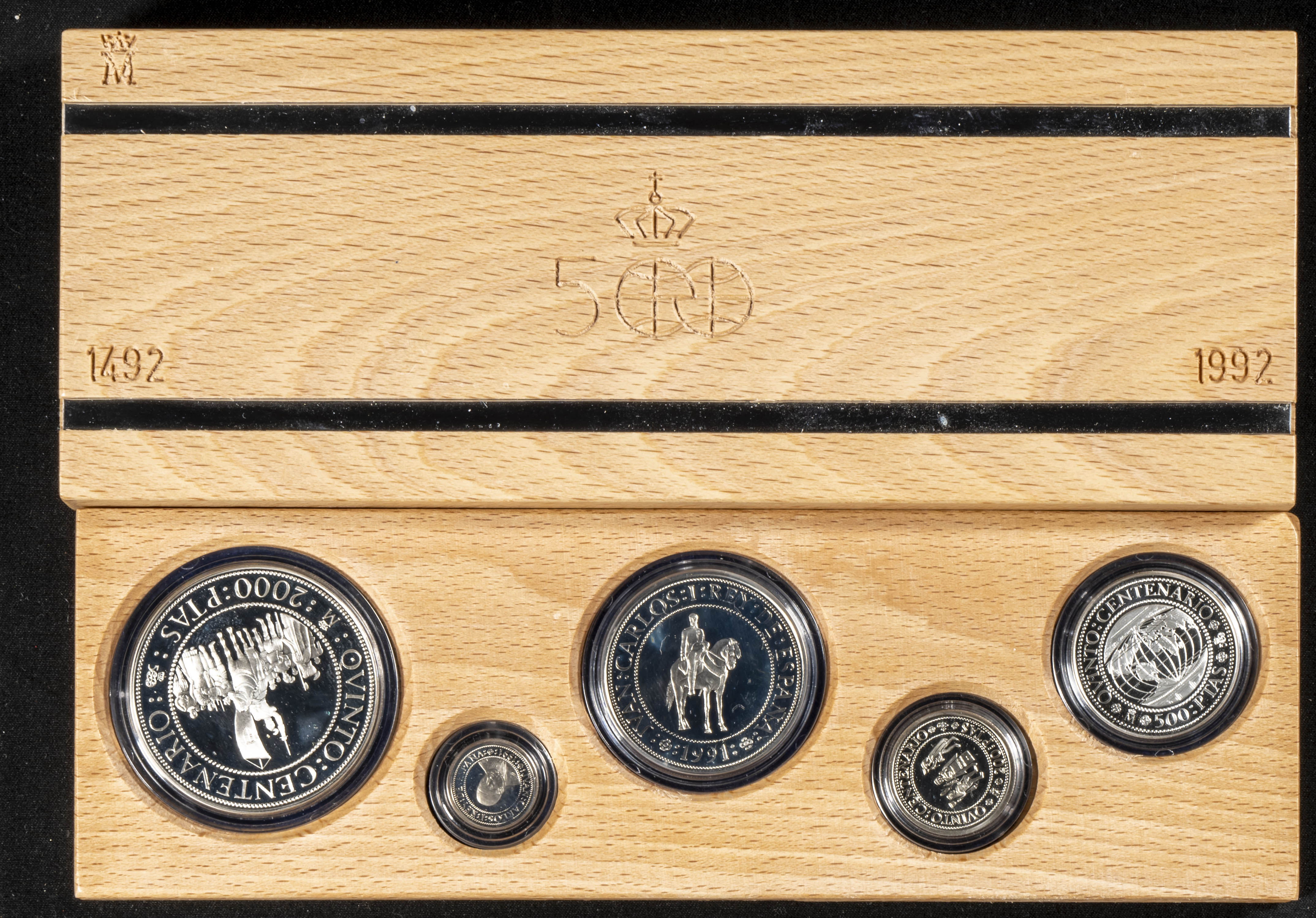 JOHN CARLOS I (1795-2014). Case composed of 5 silver coins with values between 100 and 2000 Pesetas. Fifth centenary. 1991. Series III. Carlos I. FNMT. FDC. Includes original wooden case but without cardboard packaging or certificate of authenticity.