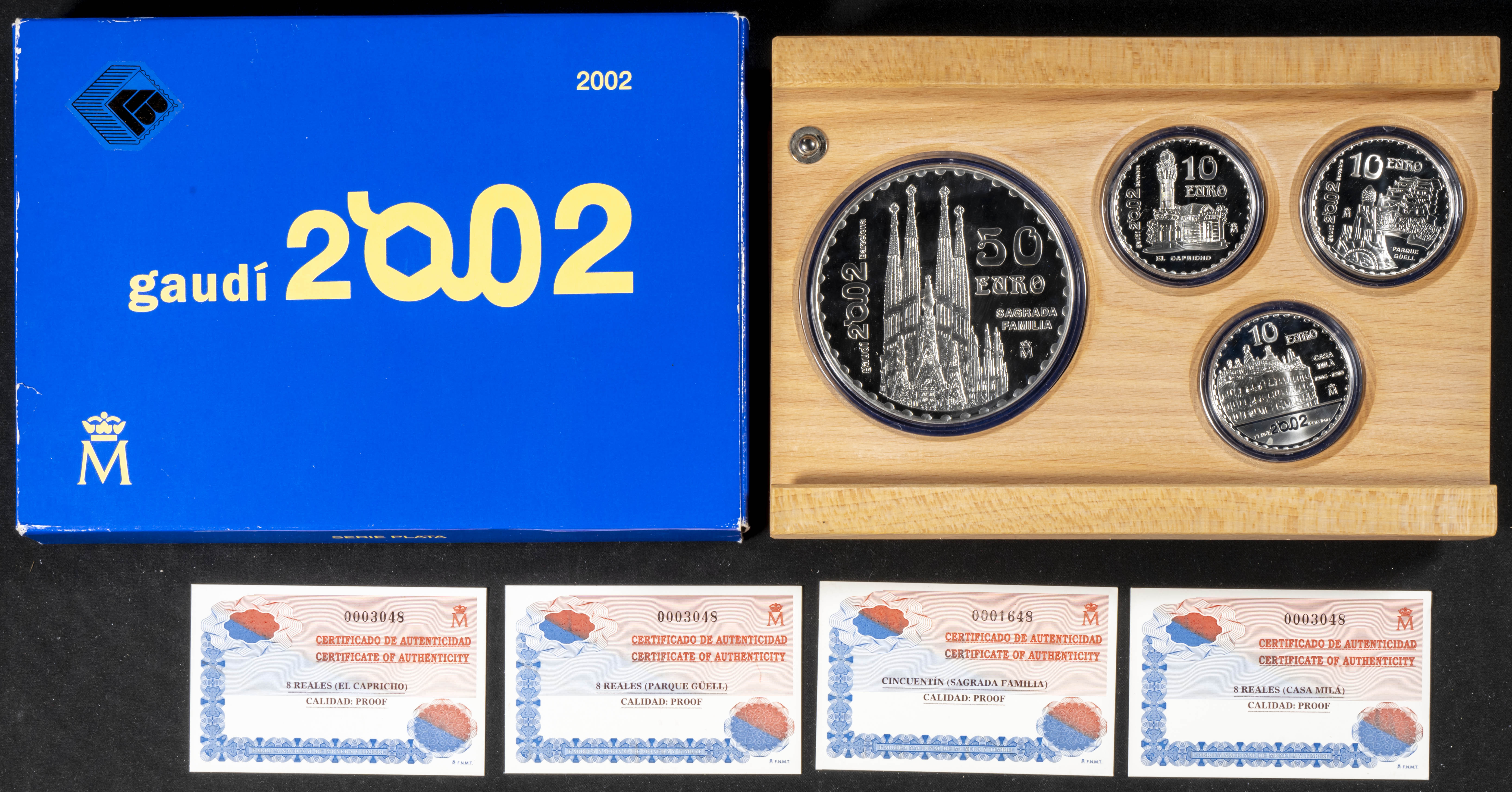 JUAN CARLOS I (1975-2014). Gaudí 2002. Serie Completa en plata. 4 valores: 50 Euro (1) y 10 Euro (3) en plata. 2002. FNMT. PROOF. Peso total en plata aproximadamente: 250g. Incluye estuche original y certificados de autenticidad.