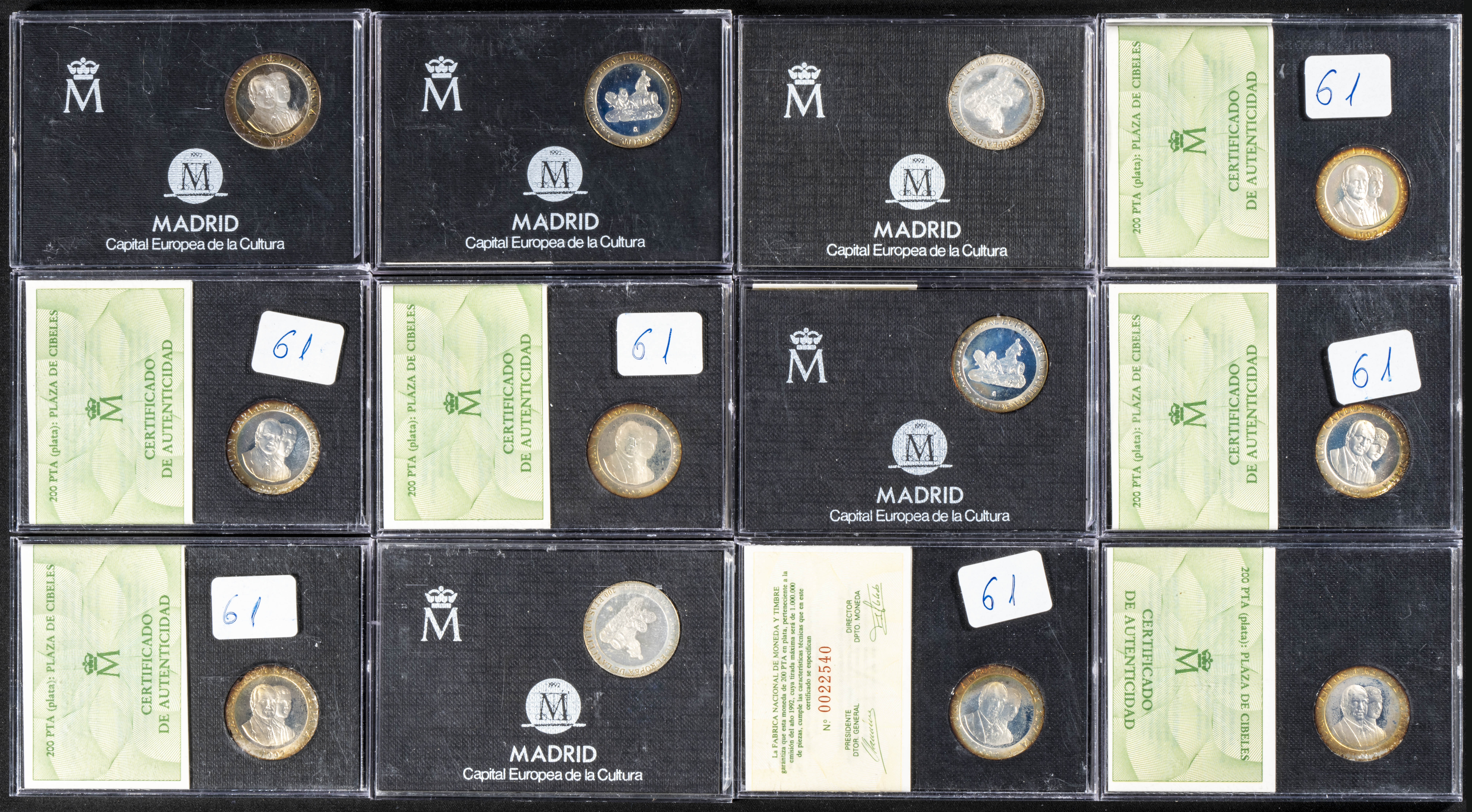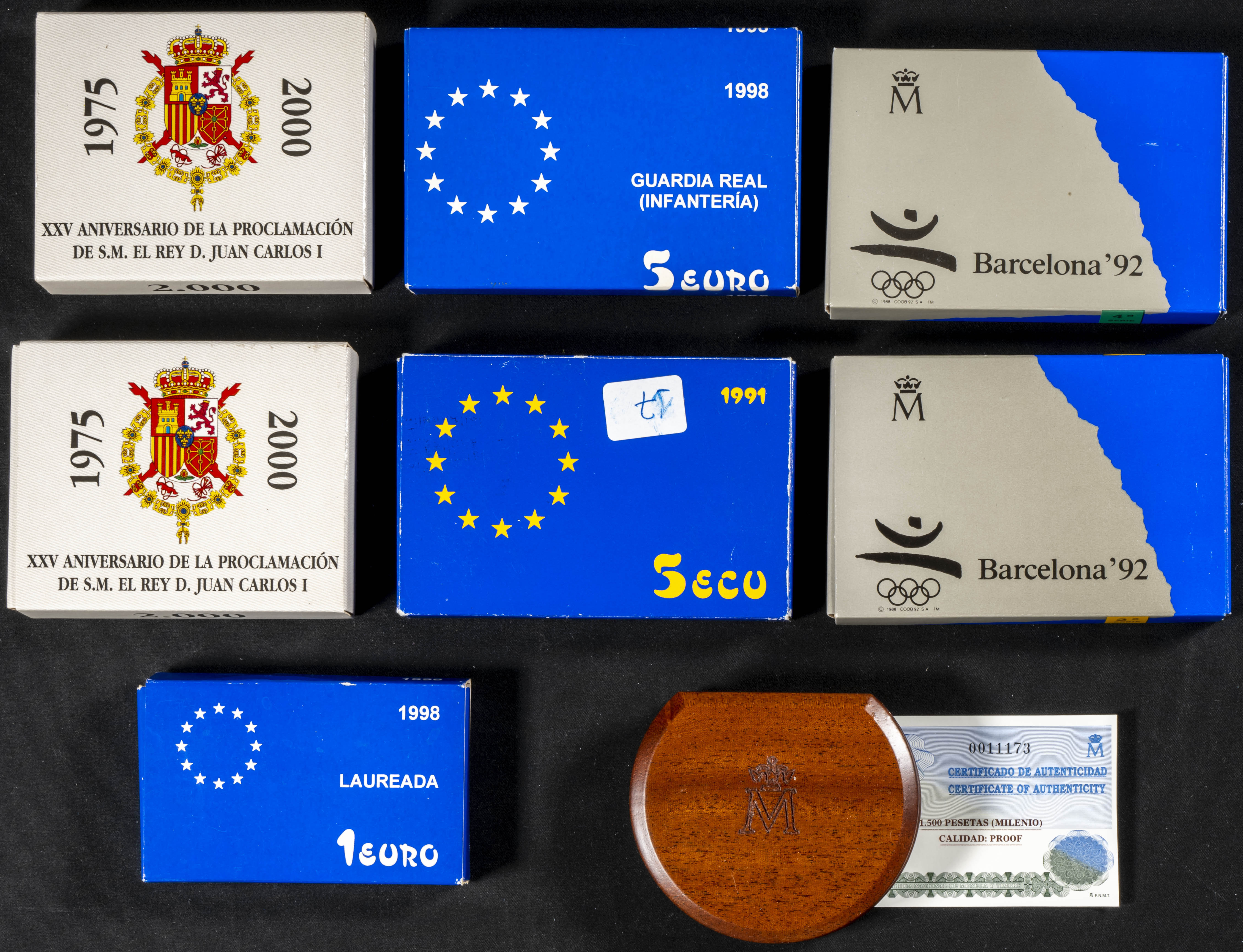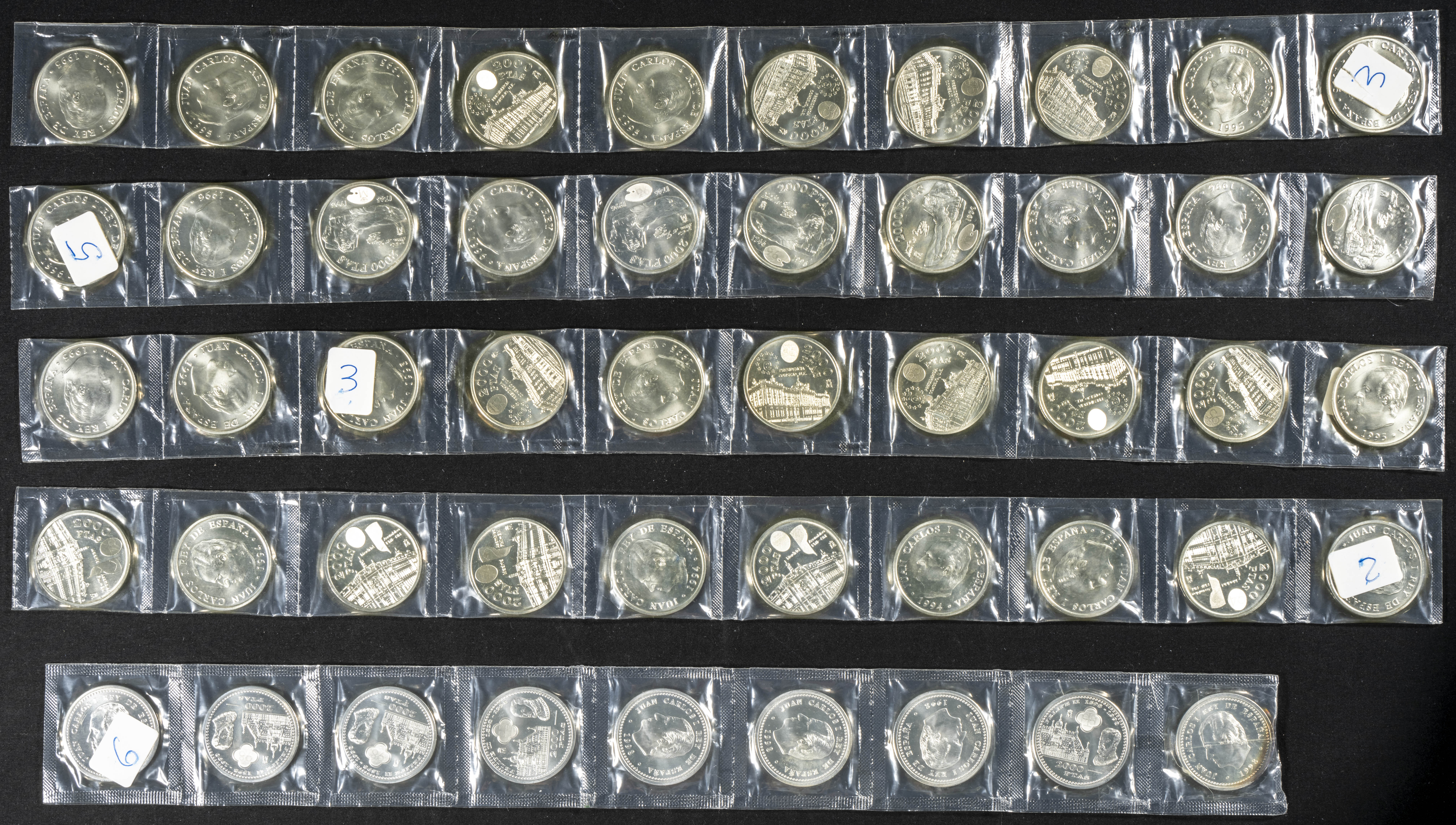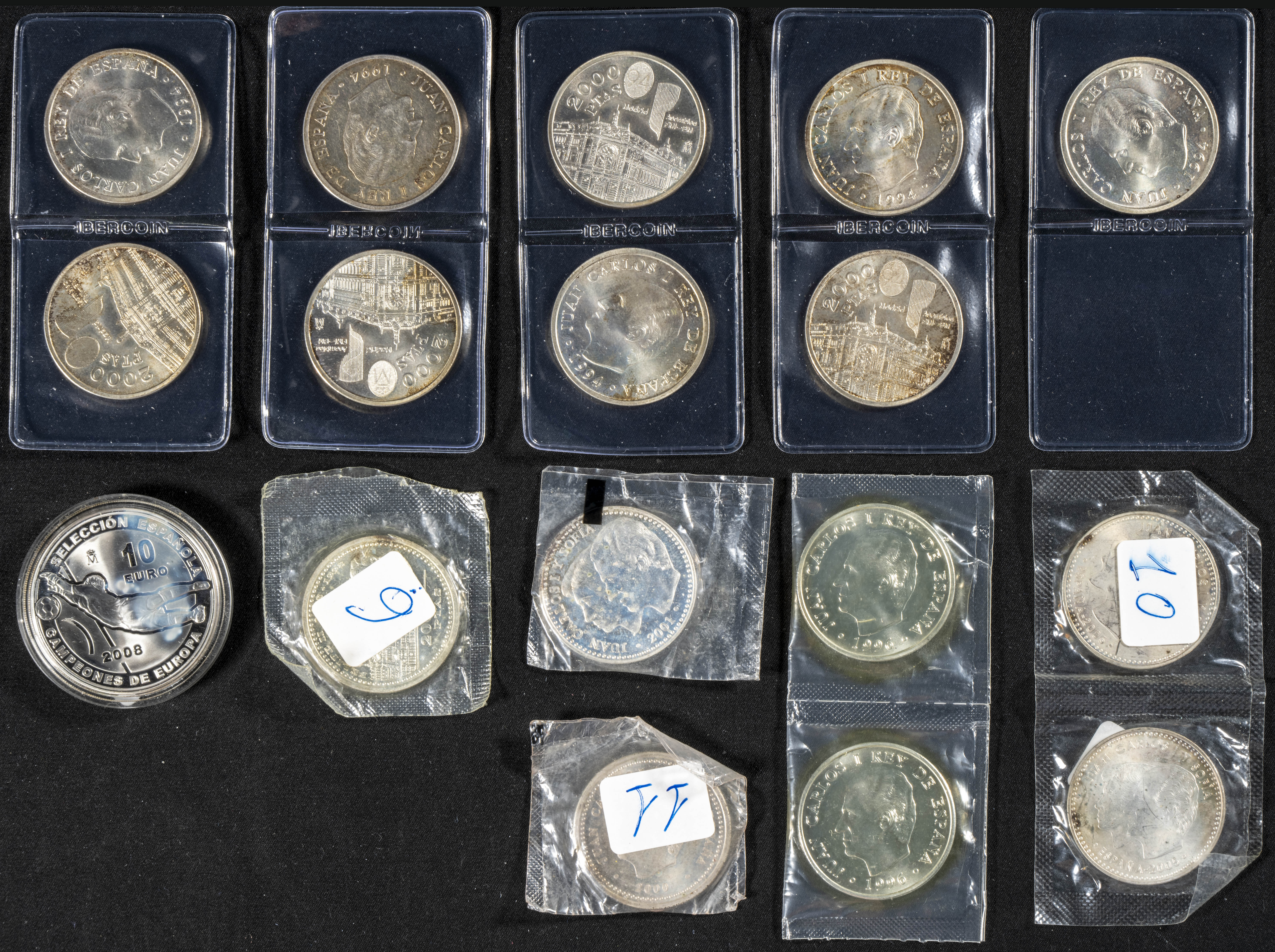 JUAN CARLOS I (1975-2014). Magnífico conjunto formado por 118 monedas de plata en tiras, estuches y sueltas: destacan en el conjunto 96 piezas de 2000 Pesetas (acuñadas entre 1994 y el año 2001), ejemplares de 200 Pesetas en plata de 1992 así como Ecus y Euro. Prácticamente todas las monedas en estado SC. A EXAMINAR.