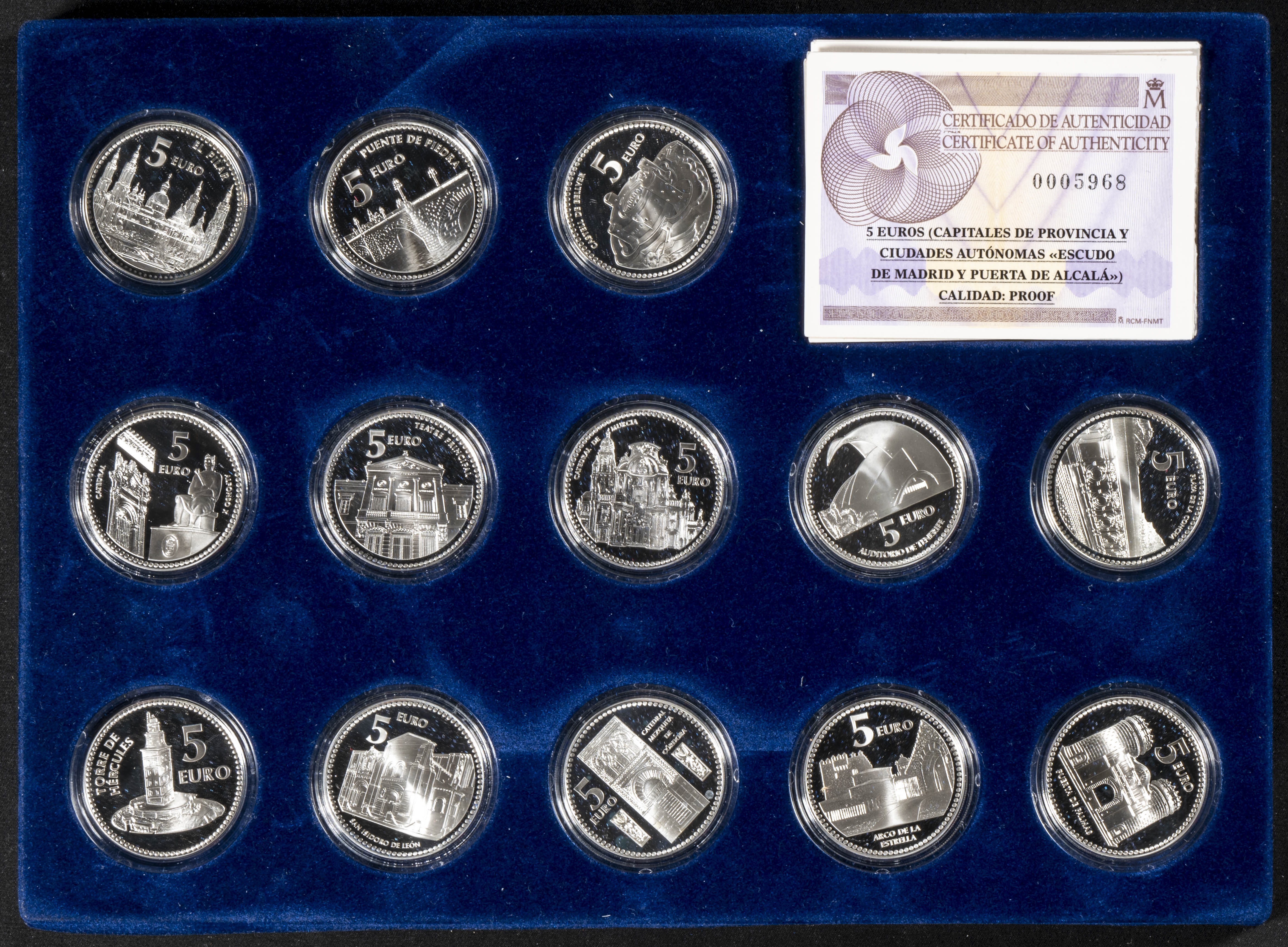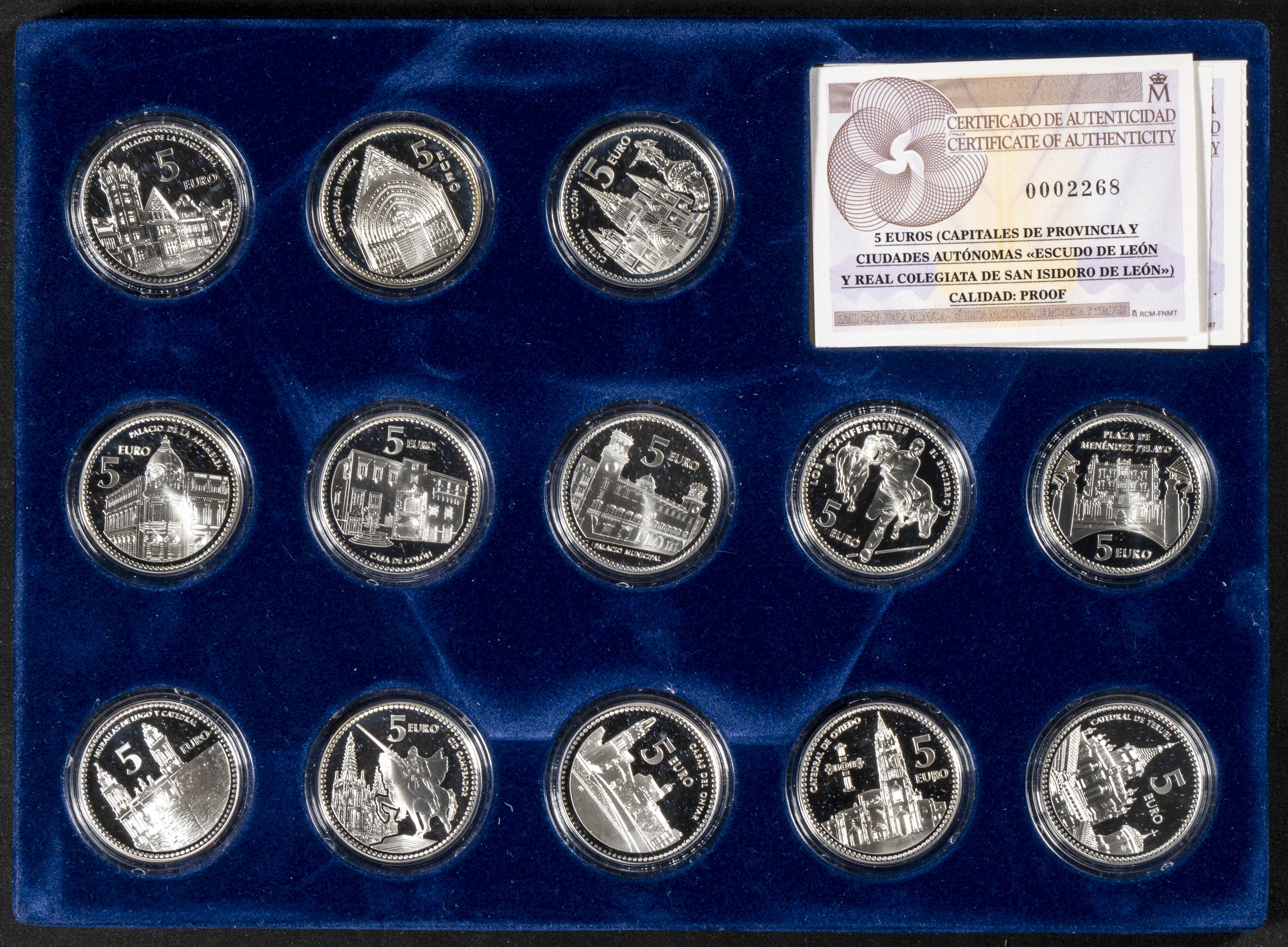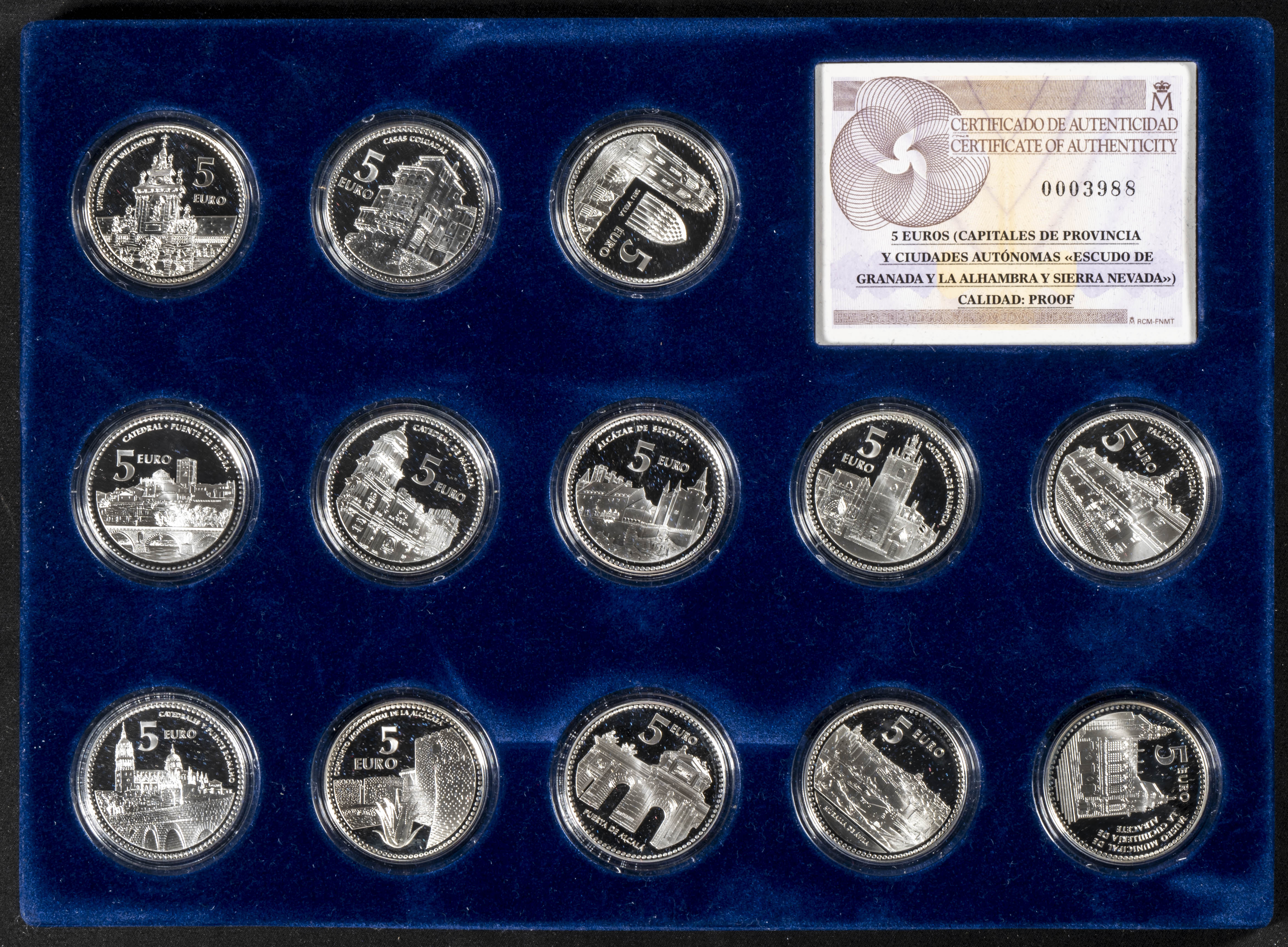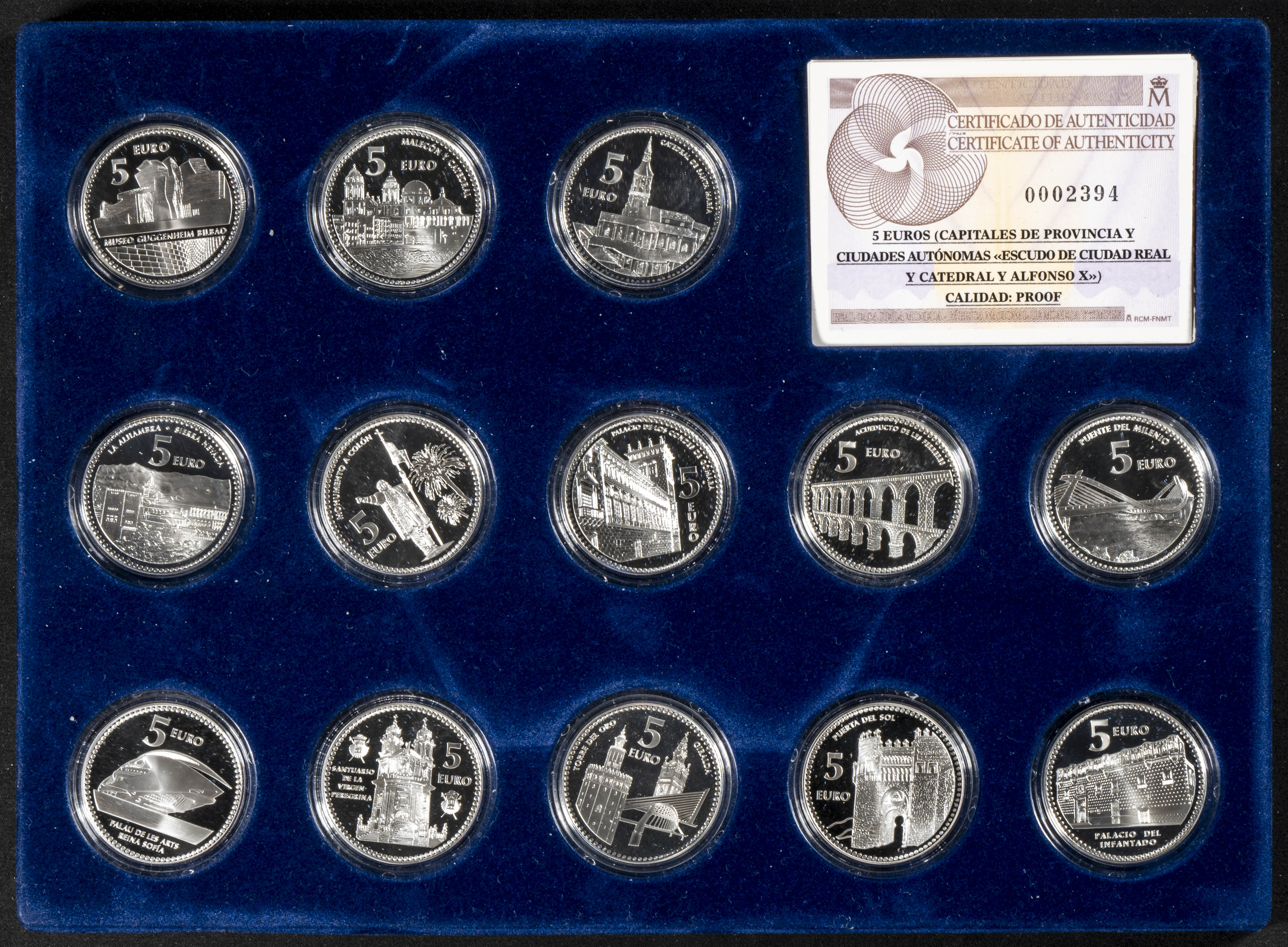 JUAN CARLOS I (1975-2014). Colección completa formada por 52 monedas de 5 € en plata correspondiente a las 52 Capitales de Provincia y Ciudades Autónomas españolas. 2010-2012. FNMT. PROOF. Incluye estuche original y certificado de autenticidad.