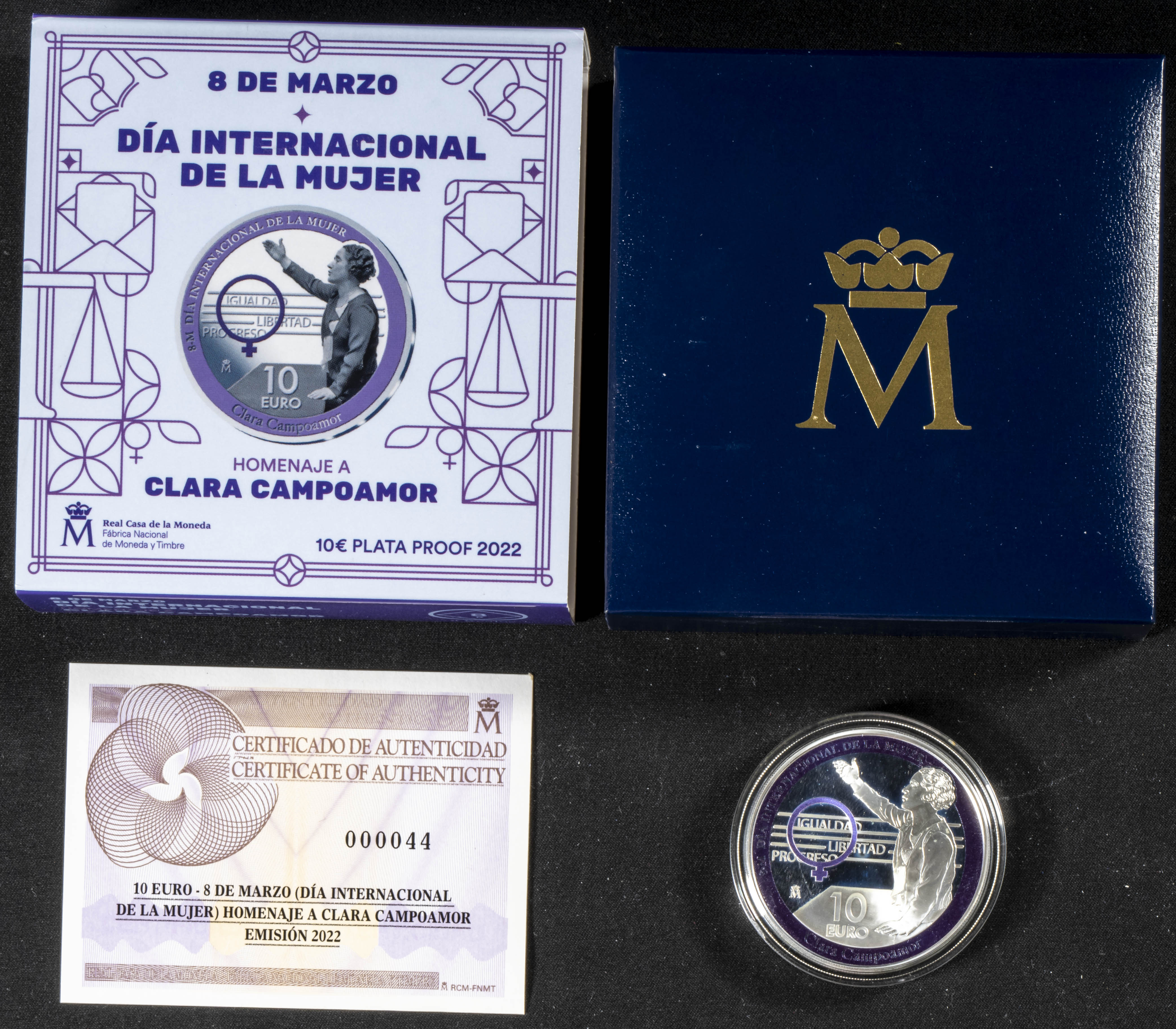 FELIPE VI (2014-?). 10 euros. (Ar. 27.00g/40mm). International Women's Day. Clara Campoamor. 2022. FNMT. PROOF. Includes original case and certificate of authenticity. Print run of 7000 units.