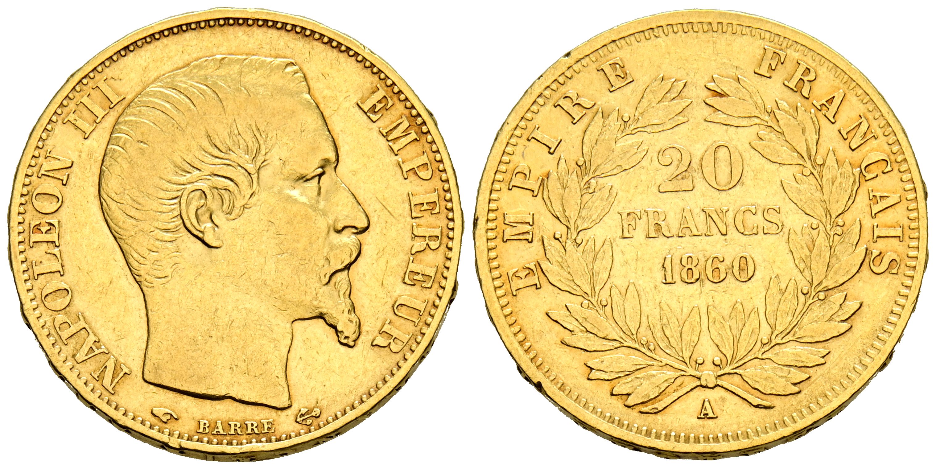 FRANCIA, Napoleón III (1852-1870). 20 Francos. (Au. 6,42g/21mm). 1860. París A. (Km#781.1). MBC-.