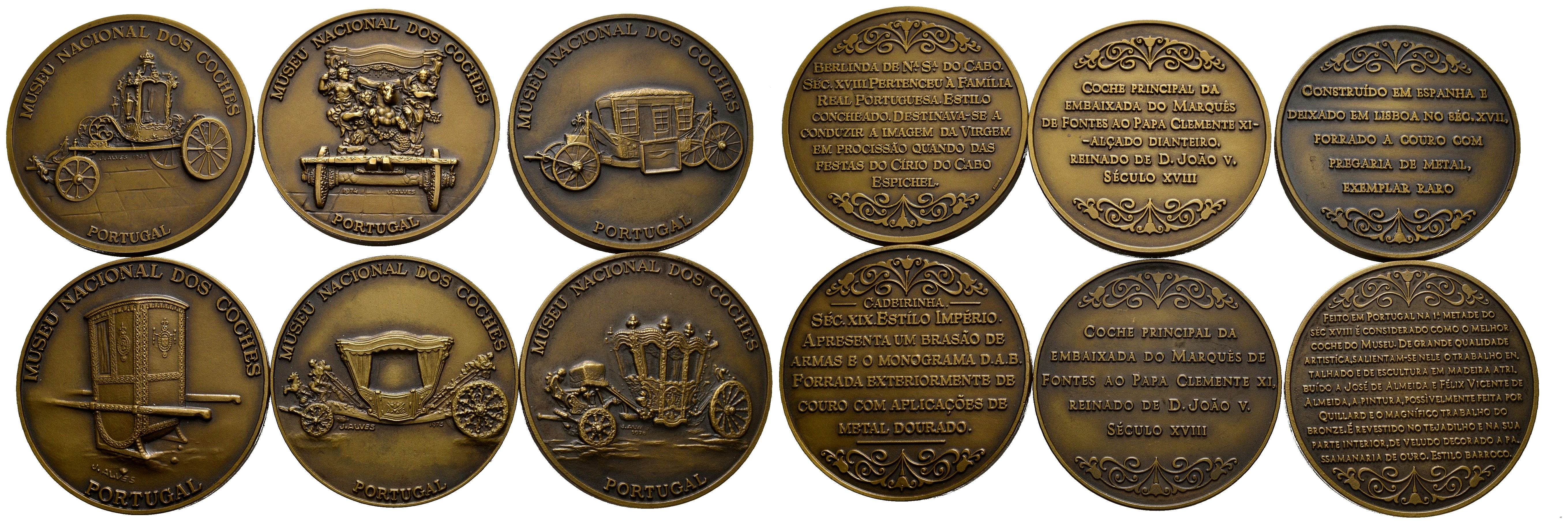 Beautiful set made up of 6 bronze medals from the Museu Nacional Dos Coches. These coins were minted in the last cuarto of the 20th century. High degree of conservation in general. No repeated piece. TO EXAMINE.