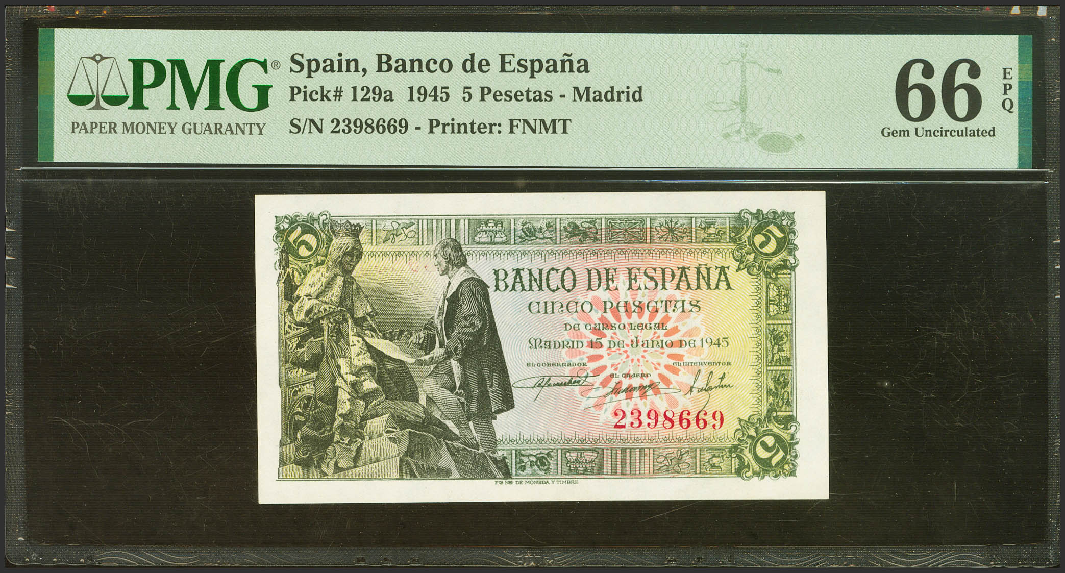 5 Pesetas. June 15, 1945. No series. (Edifil 2023: 449, Pick: 129a). Unusual in this quality, original sizing. Uncirculated. PMG66EPQ package.