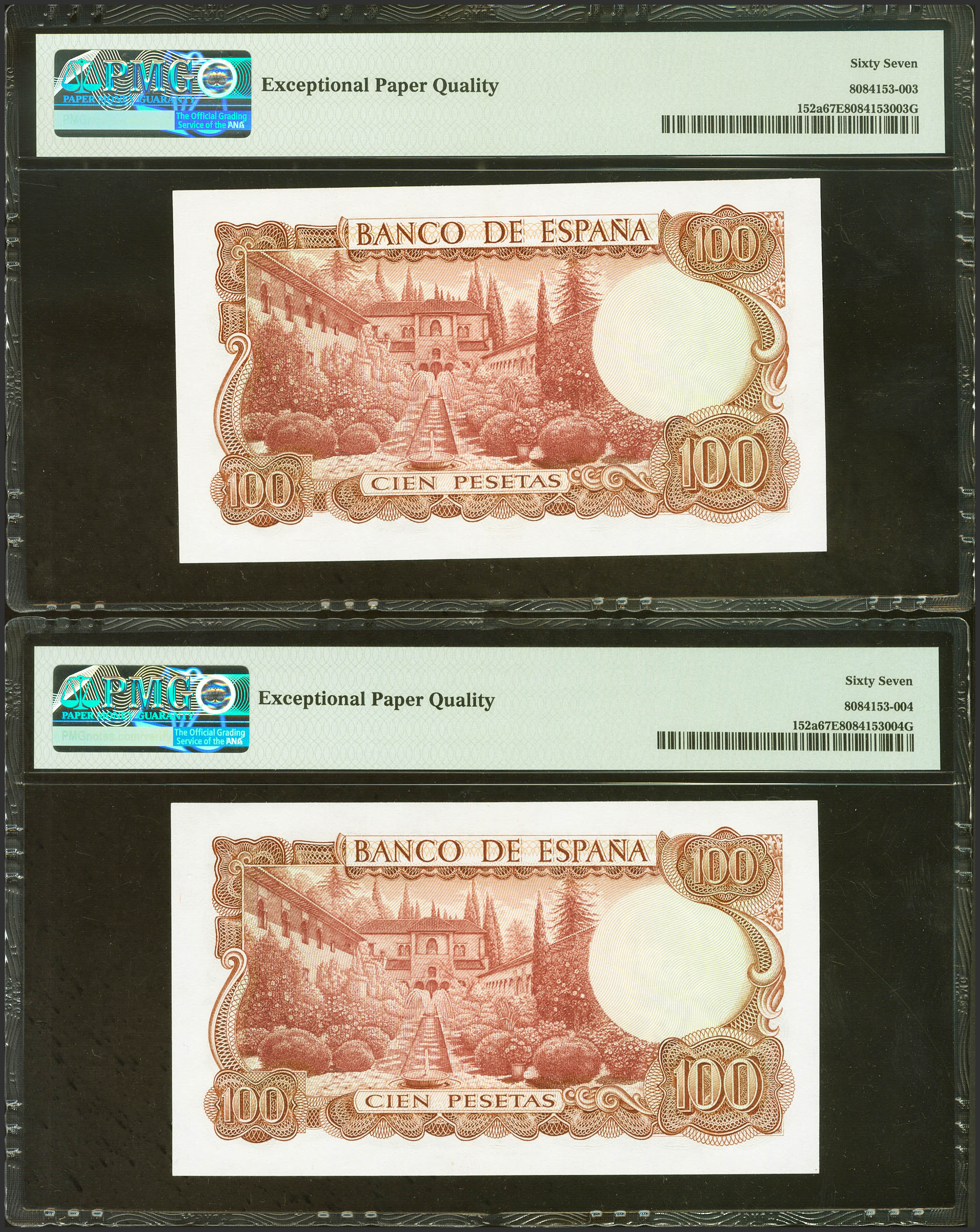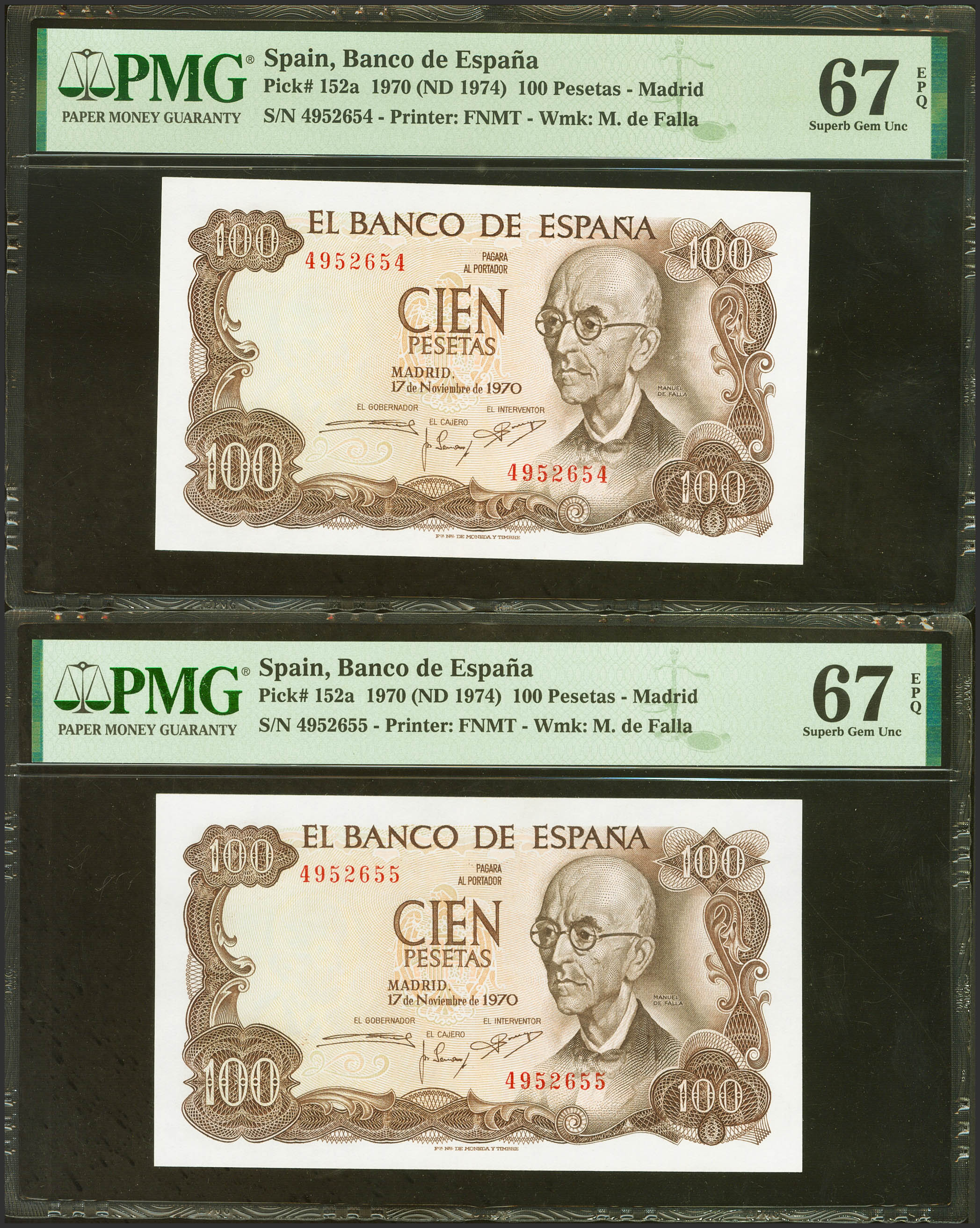 100 Pesetas. November 17, 1970. Correlative couple. No serie. (Edifil 2023: 472, Pick: 152a). Original sizing. Uncirculated. PMG67EPQ encapsulated, both.