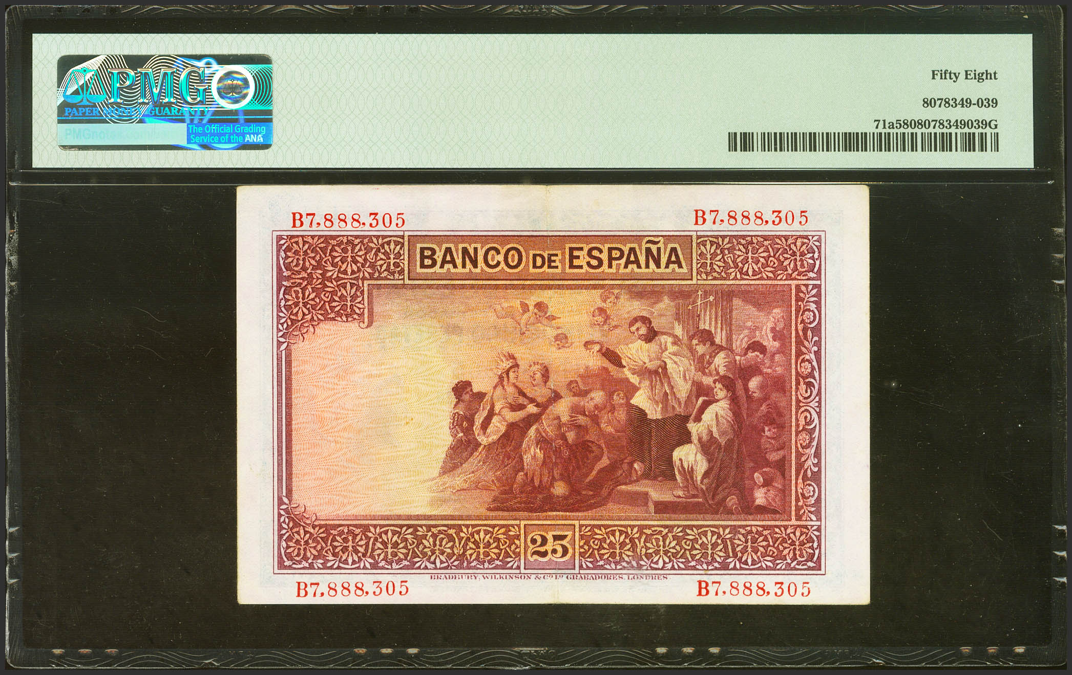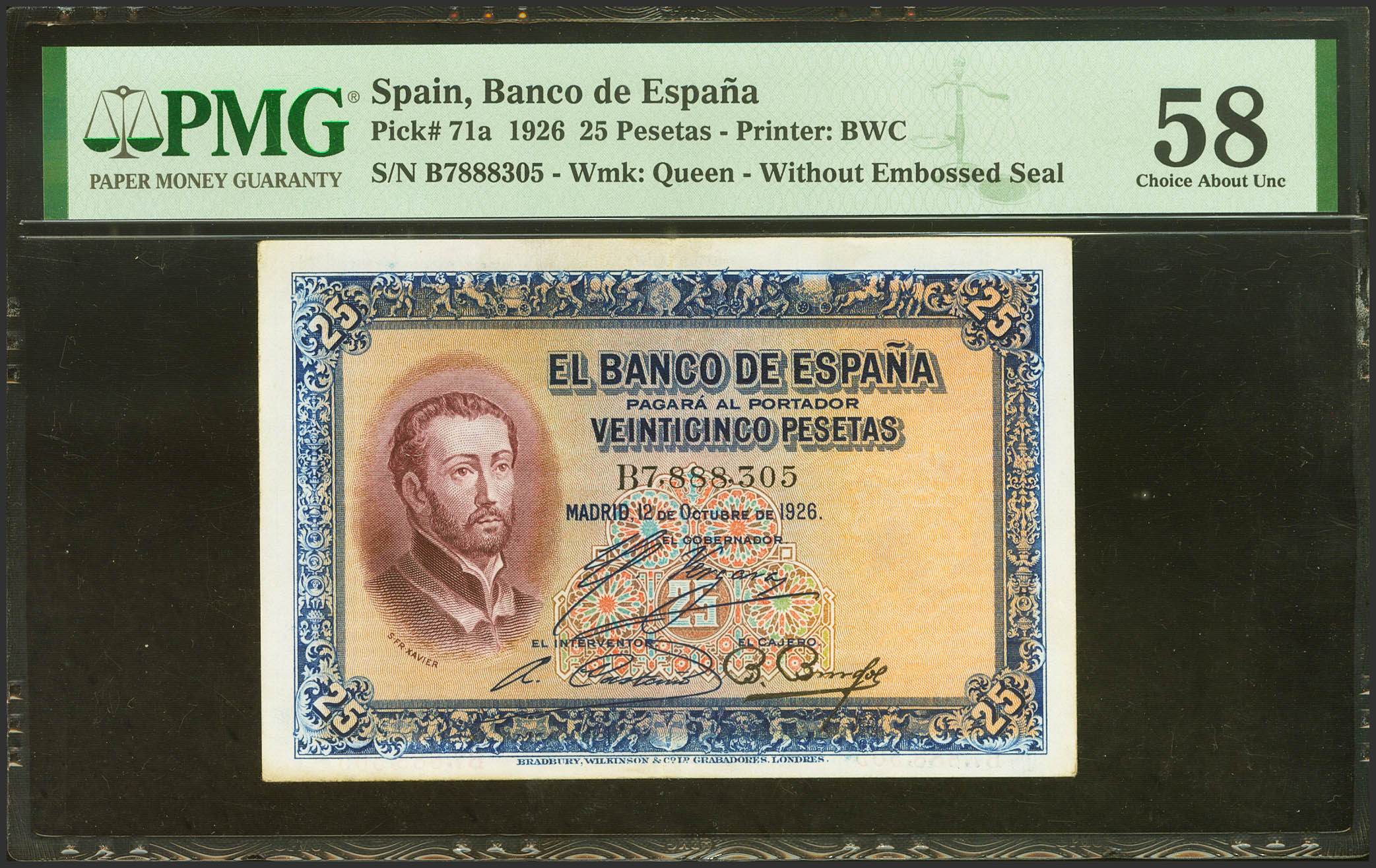 English 25 Pesetas. October 12, 1926. Series B. (Edifil 2023: 325a, Pick: 71a). Unusual in this quality. EBC++. PMG58 encapsulation.