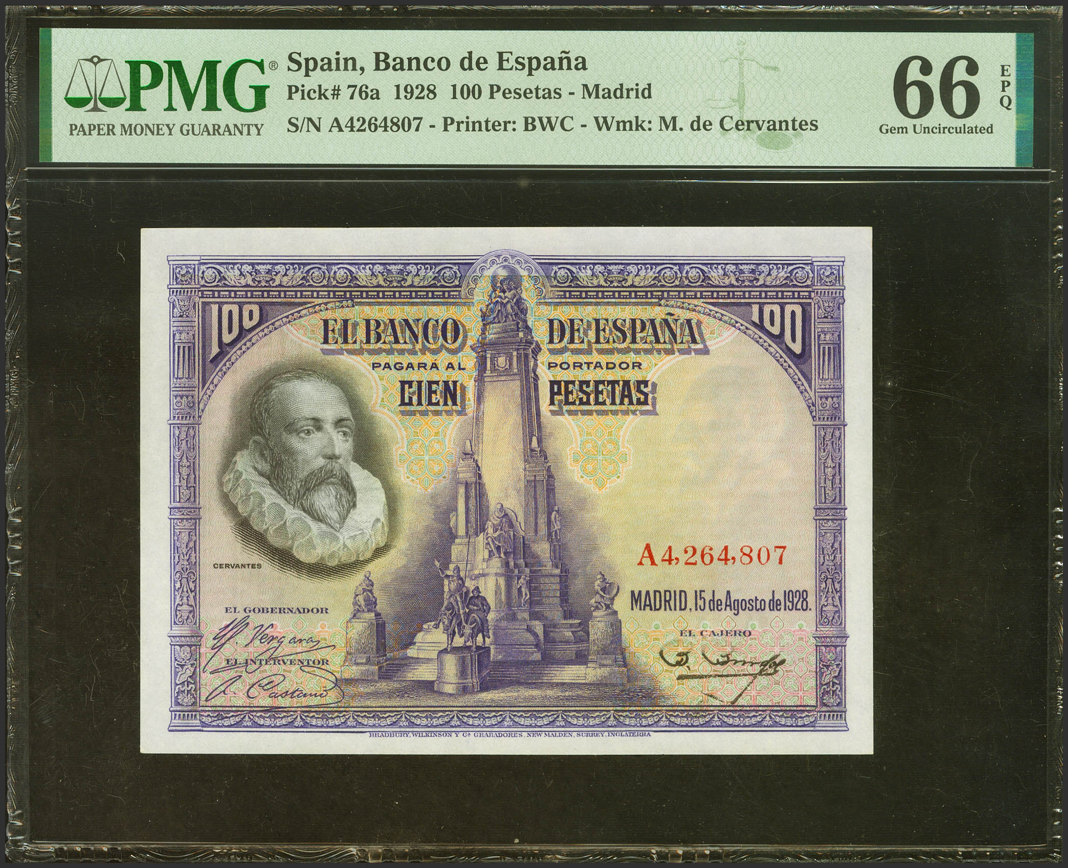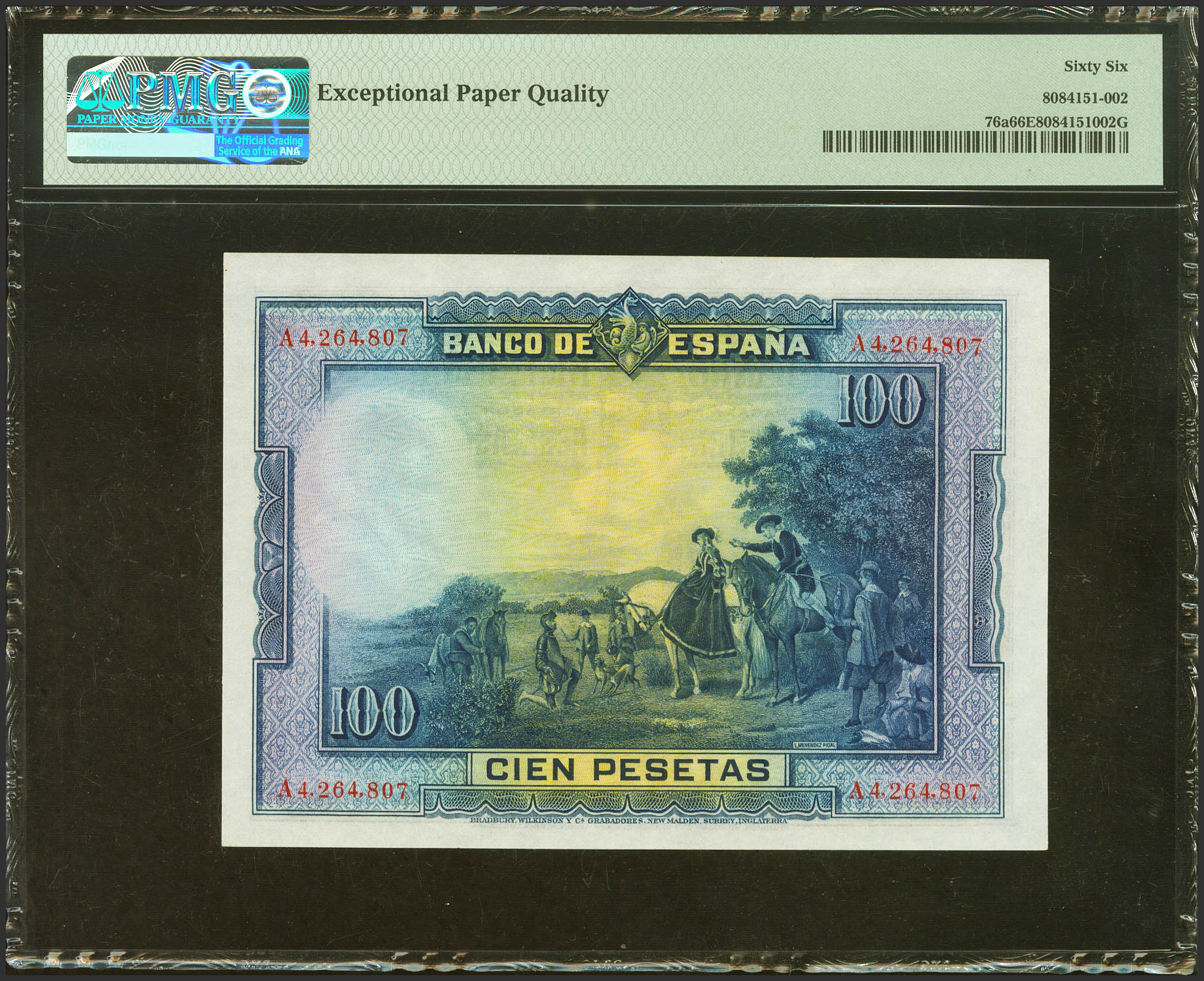 100 Pesetas. August 15, 1928. Series A. (Edifil 2023: 355a, Pick: 76a). Rare in this exceptional quality, original sizing. Uncirculated. PMG66EPQ package.