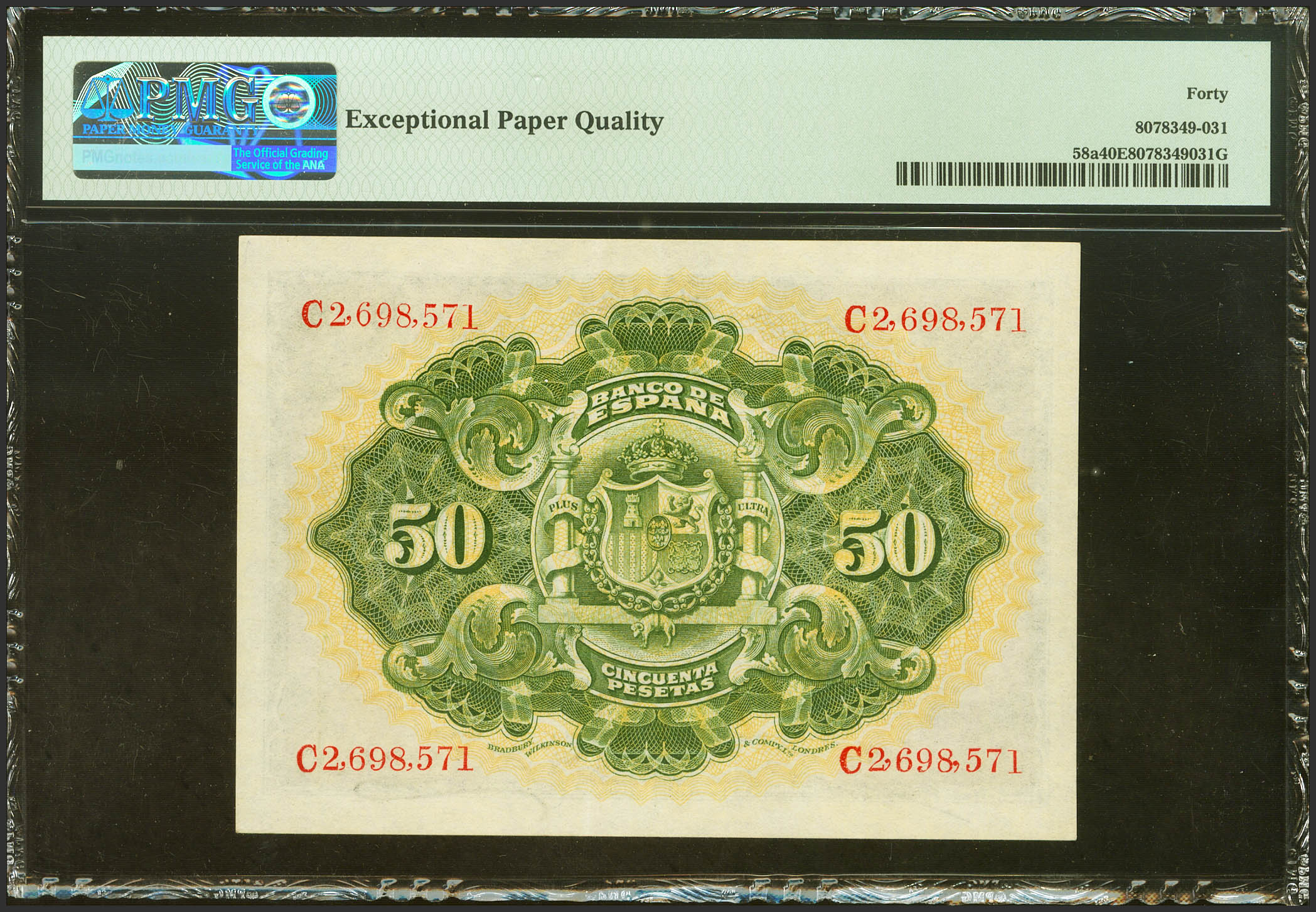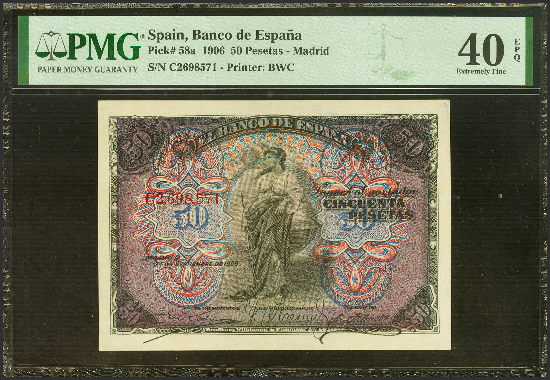 50 Pesetas. September 24, 1906. Series C, last series issued. (Edifil 2023: 315a, Pick: 58a). Original sizing. Almost Extremely Fine. PMG40EPQ package.