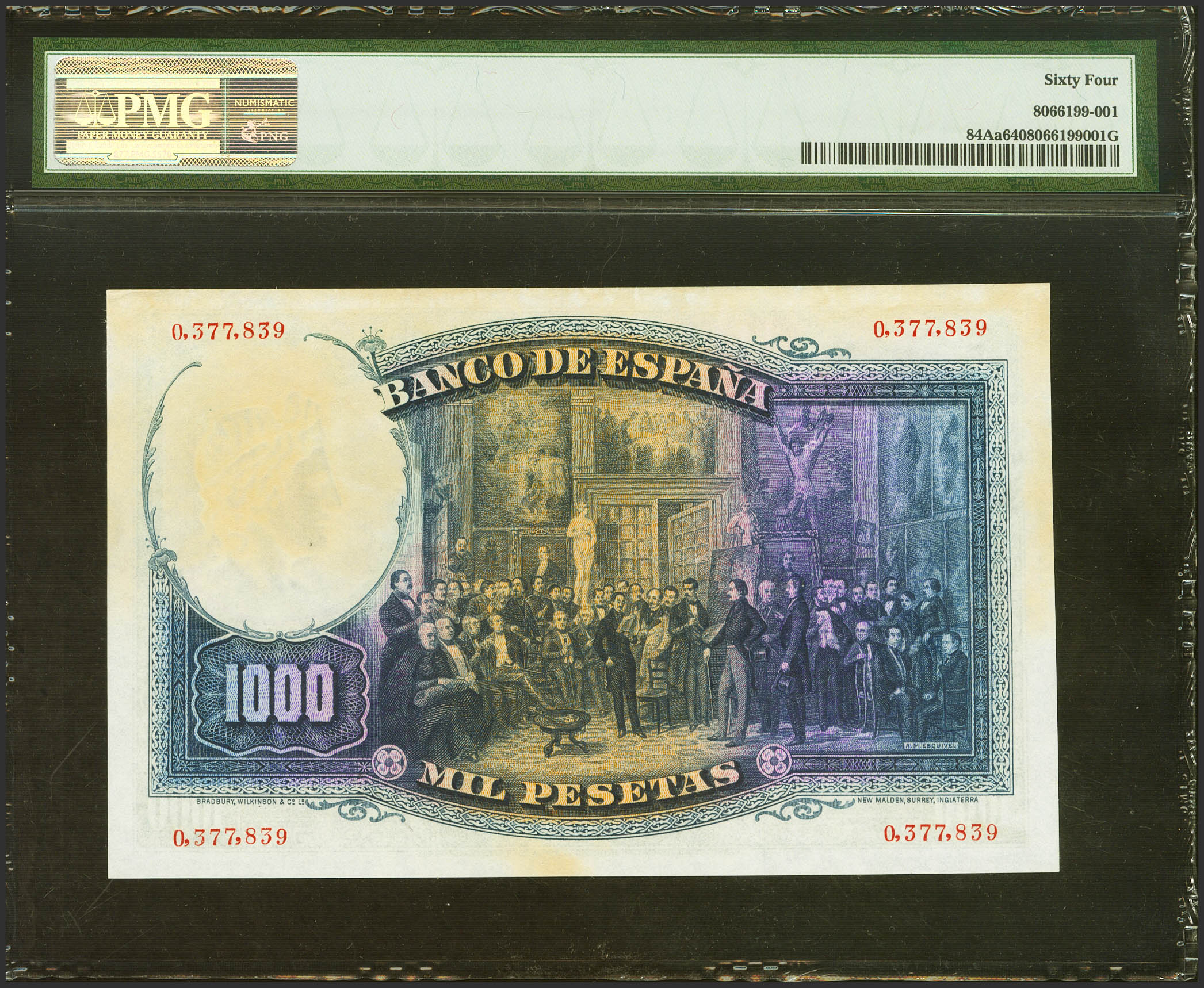 1000 Pesetas. April 25, 1931. No series. (Edifil 2023: 362, Pick: 84Aa). Appreciable stain of time. Almost Uncirculated. PMG64 encapsulation.