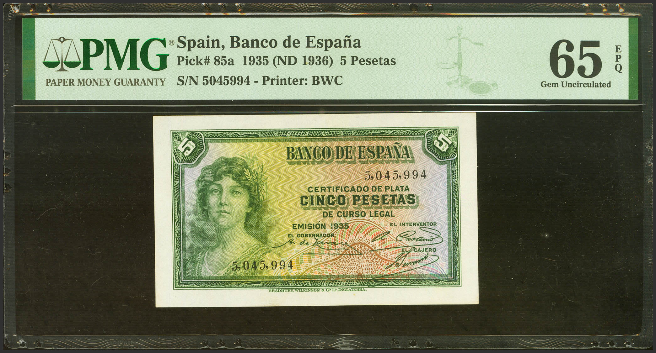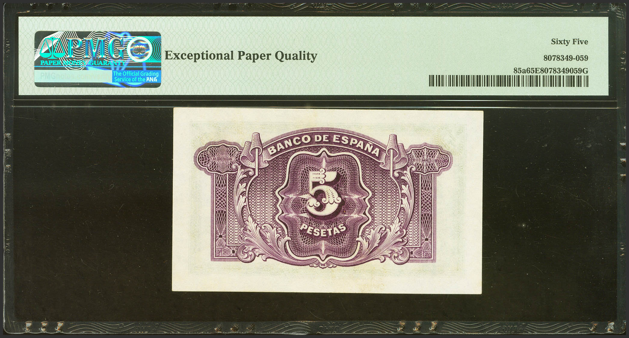 5 Pesetas. 1935. Silver Certificate. No serie. (Edifil 2023: 363, Pick: 85a). Original sizing. Uncirculated. PMG65EPQ package.