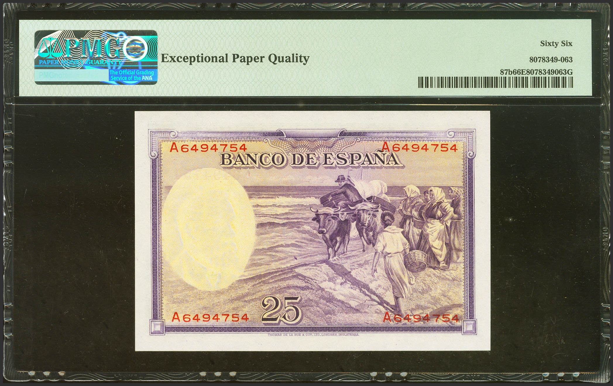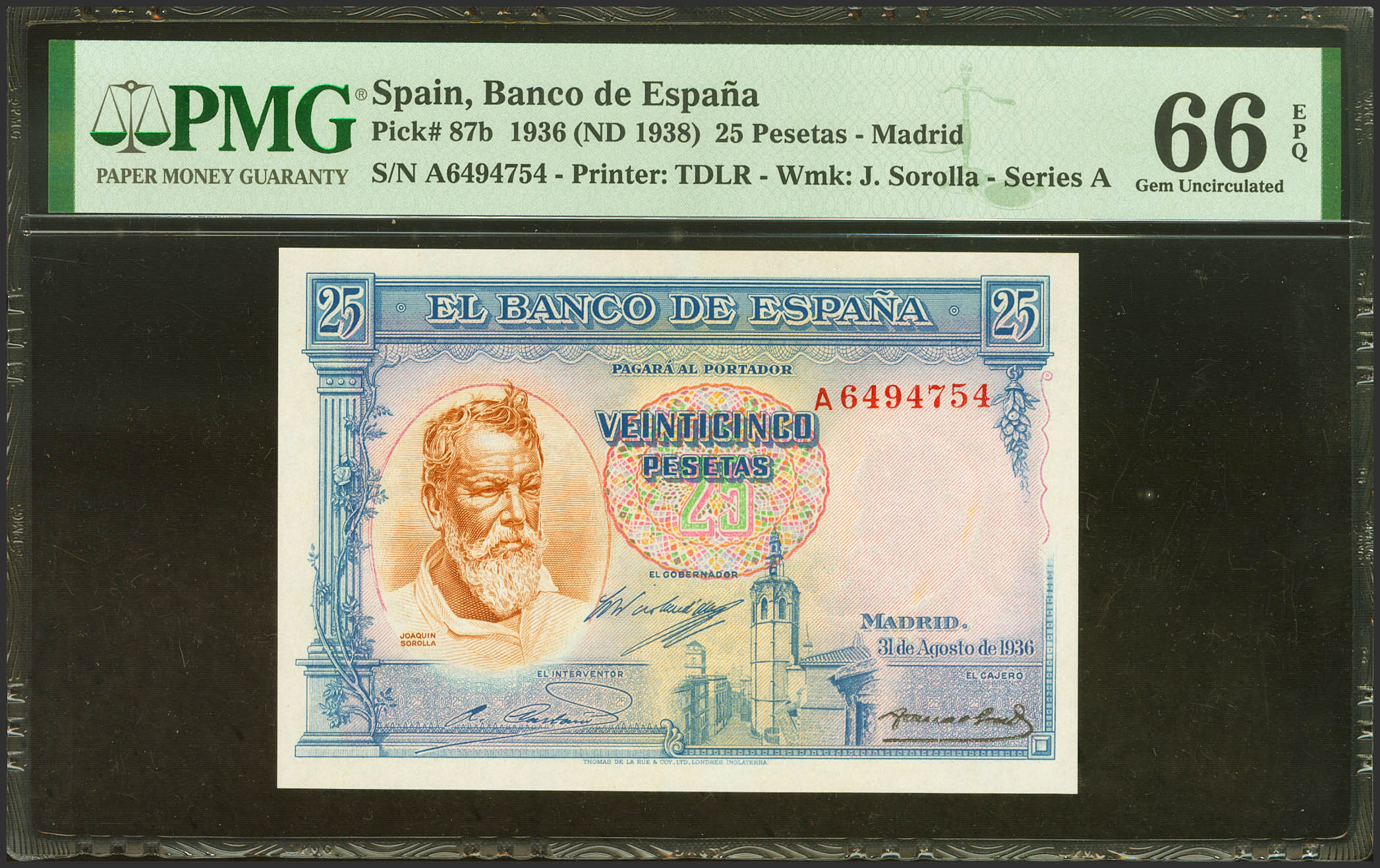 25 Pesetas. August 31, 1936. Series A. (Edifil 2023: 367a, Pick: 87b). Rare in this exceptional quality, original sizing. PMG66EPQ package.