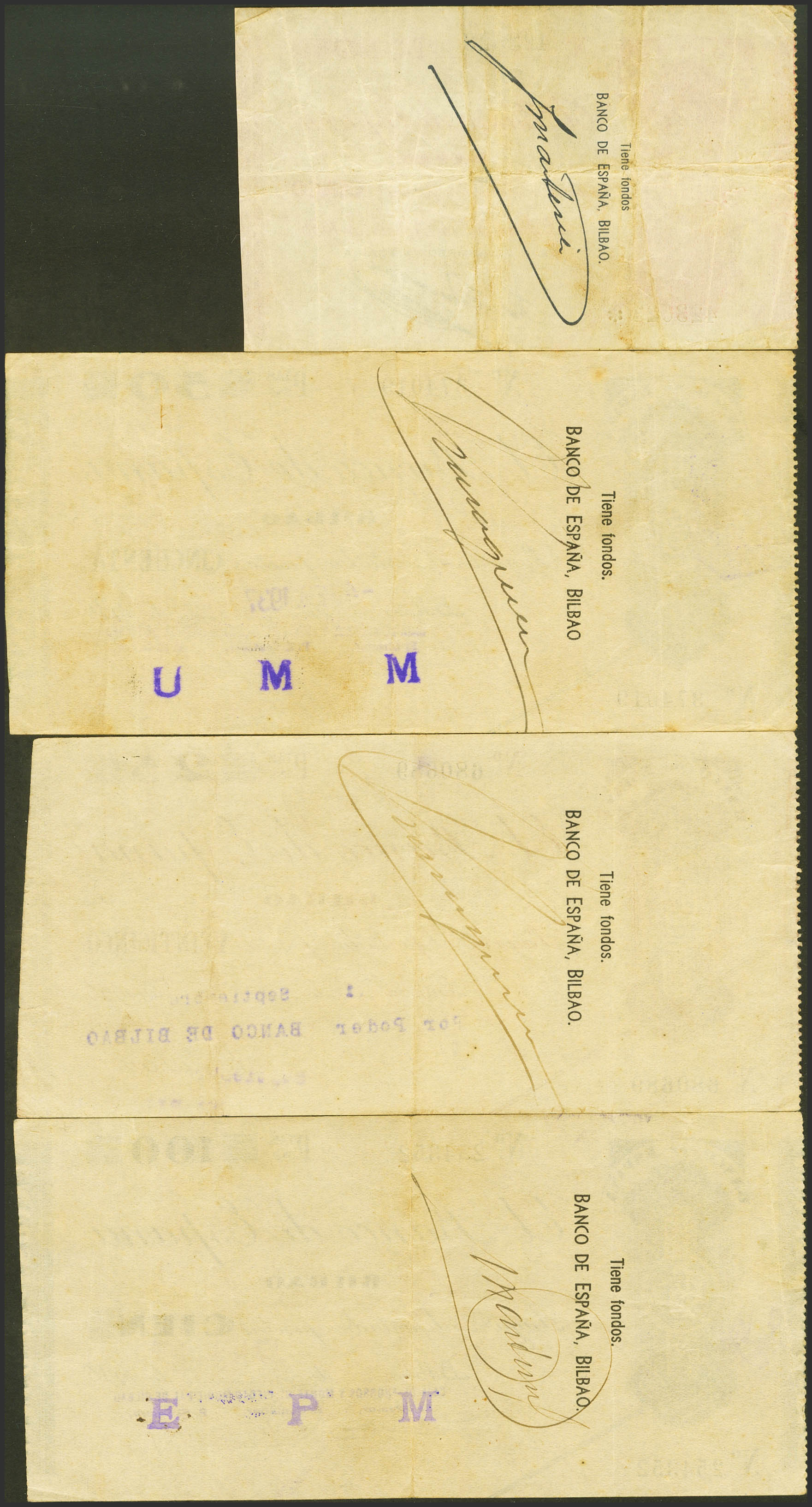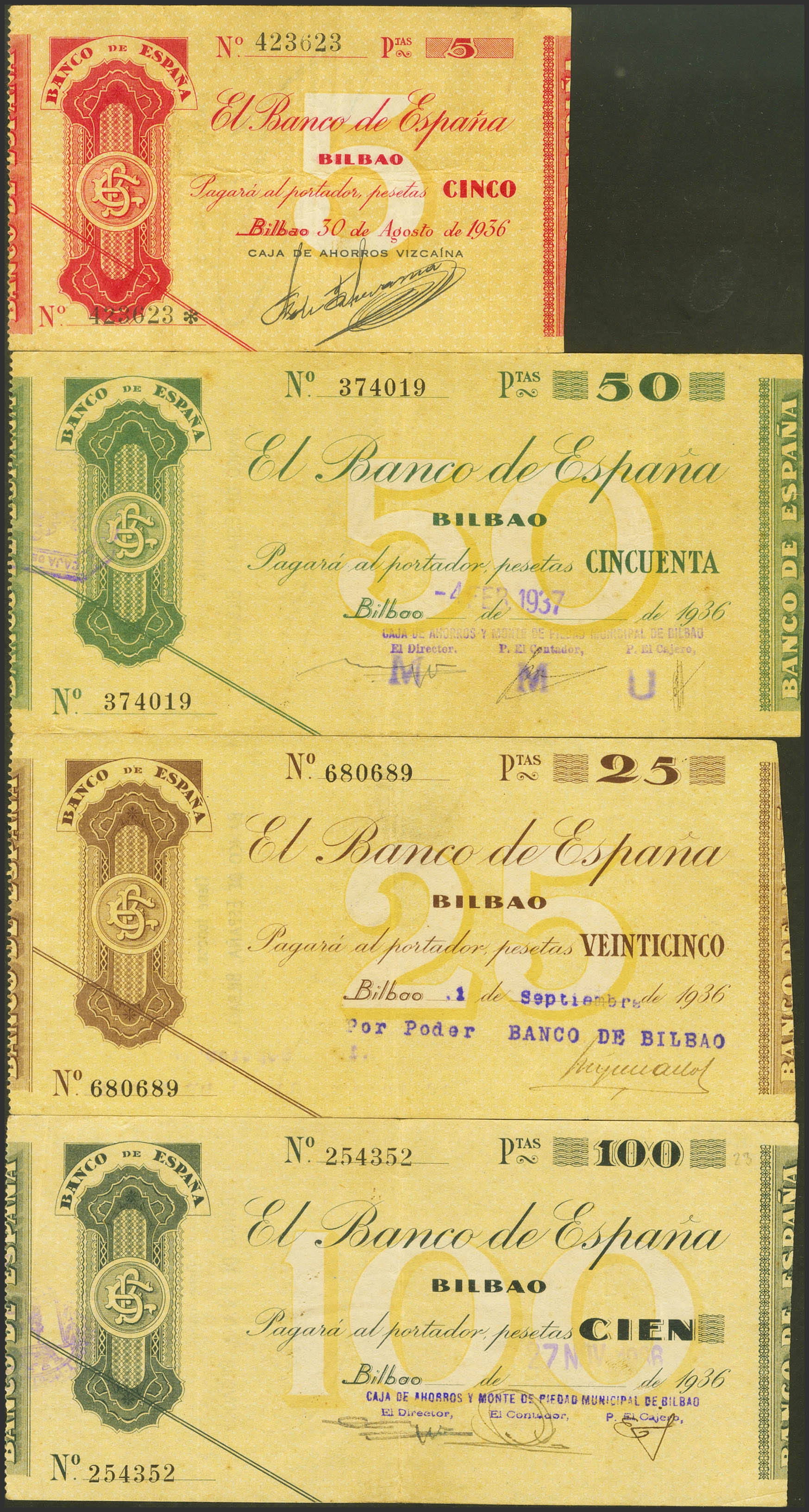 Complete series of 4 banknotes of 5 Pesetas, 25 Pesetas, 50 Pesetas and 100 Pesetas, in the absence of the 5 Pesetas with series A. (Edifil 2023: 368/371). Good Very Fine.