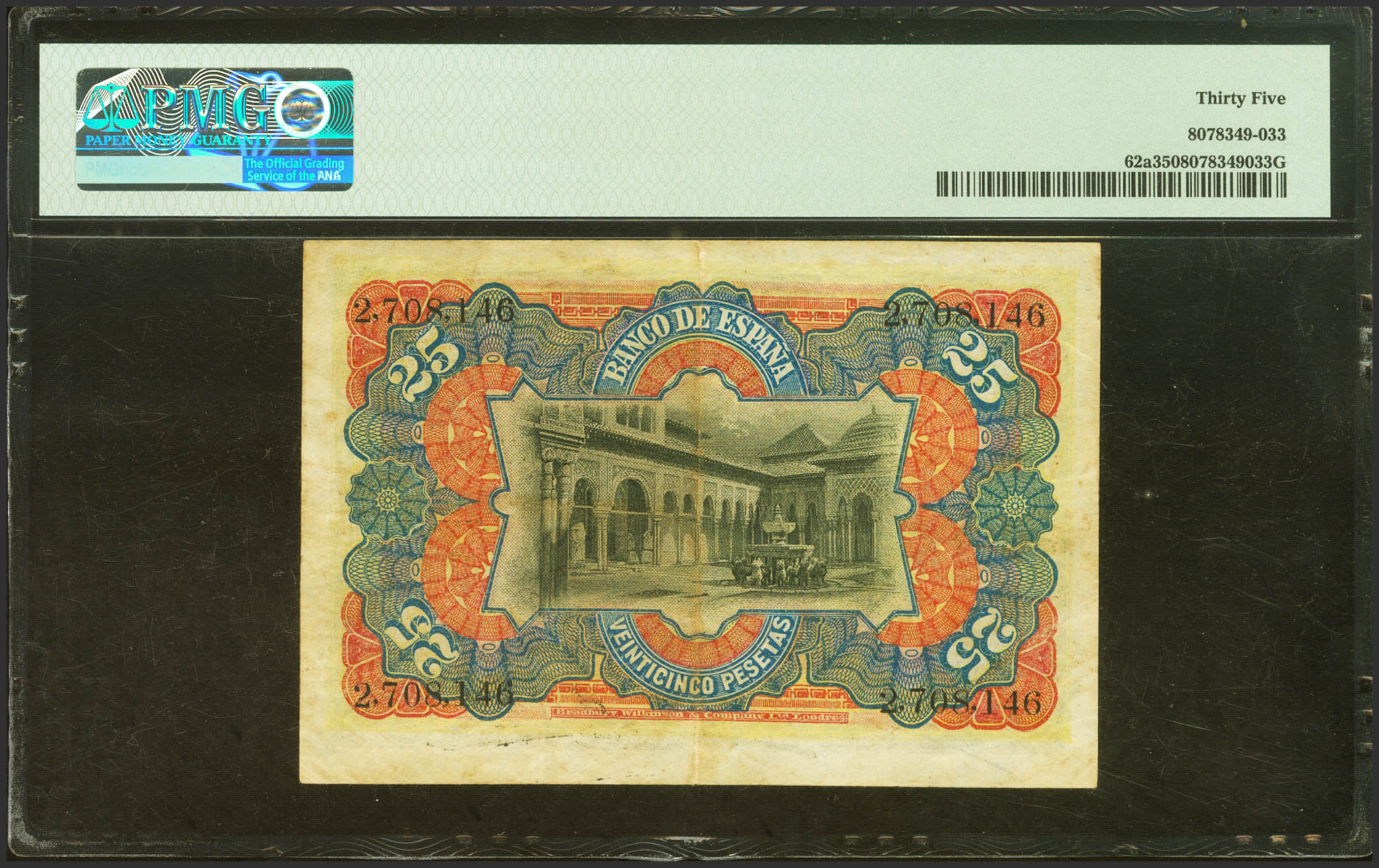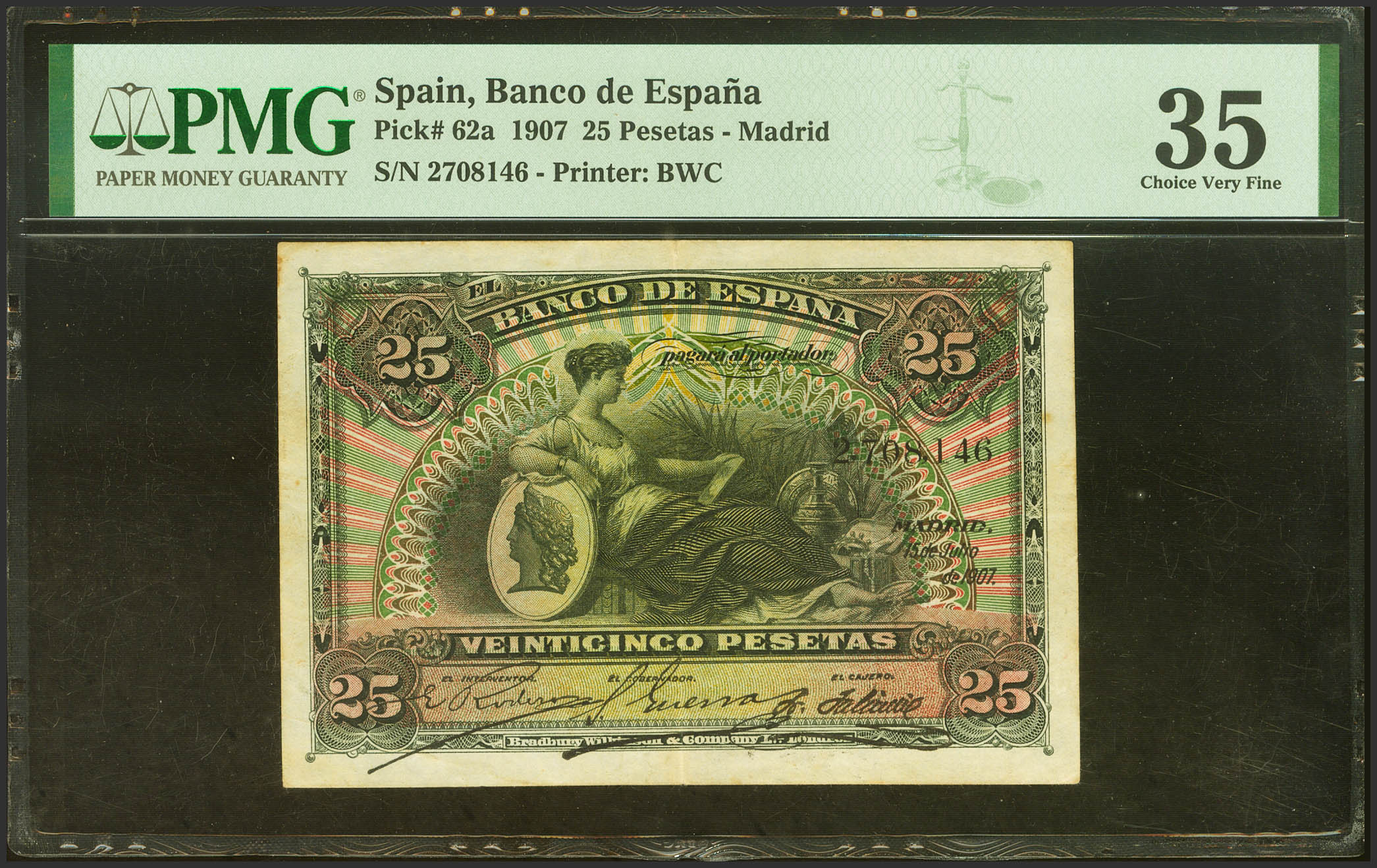 English 25 Pesetas. July 15, 1907. No series. (Edifil 2023: 318, Pick: 62a). Good Very Fine. PMG35 encapsulation.