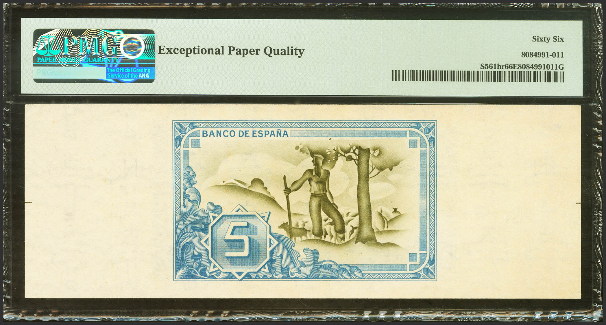 English 5 Pesetas. January 1, 1937. Bilbao Branch, preliminary signature of Caja de Ahorros y Monte de Piedad Municipal de Bilbao. Without series and without numbering, with both matrices. (Edifil 2023: 385c, Pick: S561hr). Original sizing. Uncirculated. PMG66EPQ package.