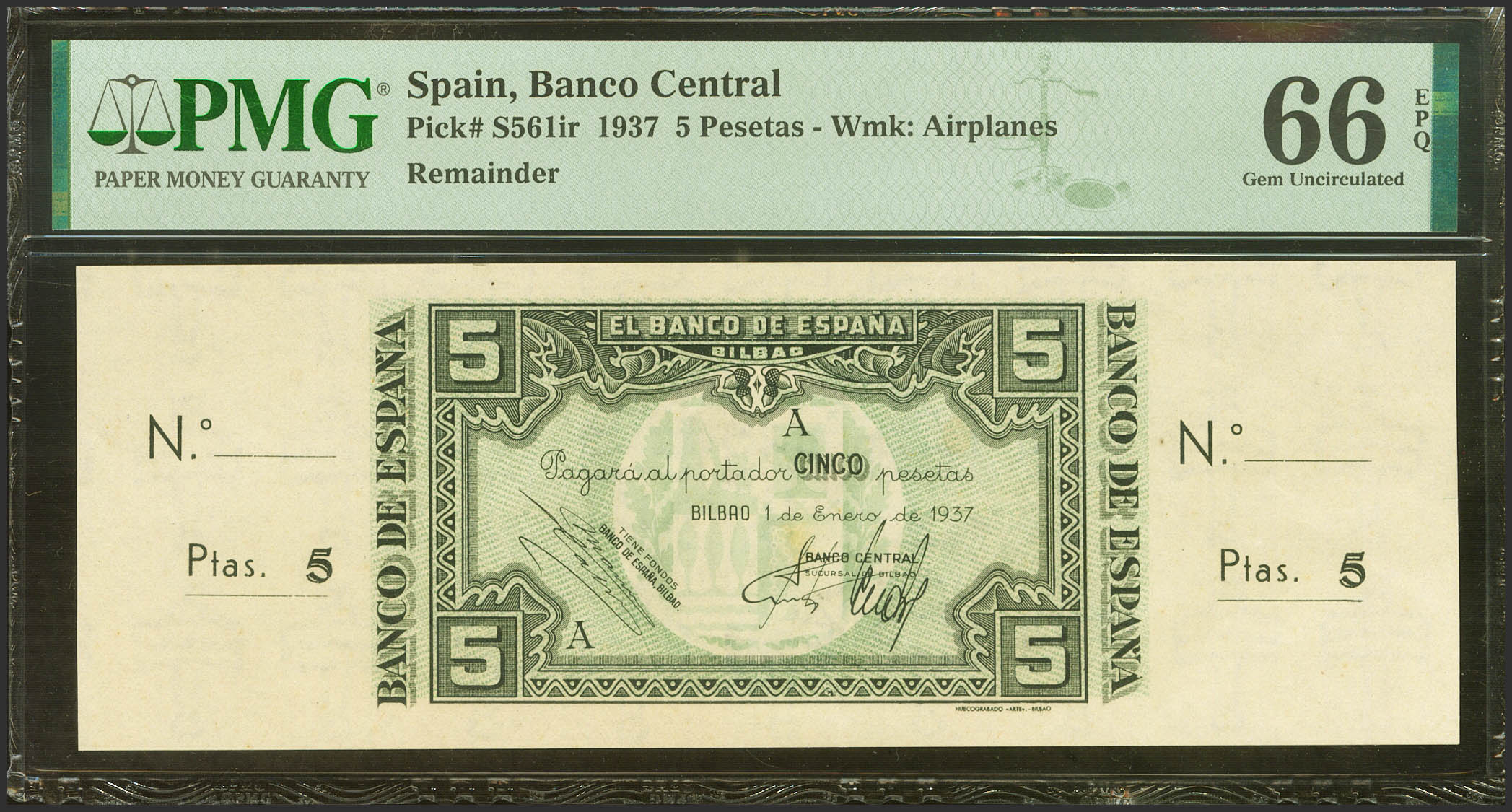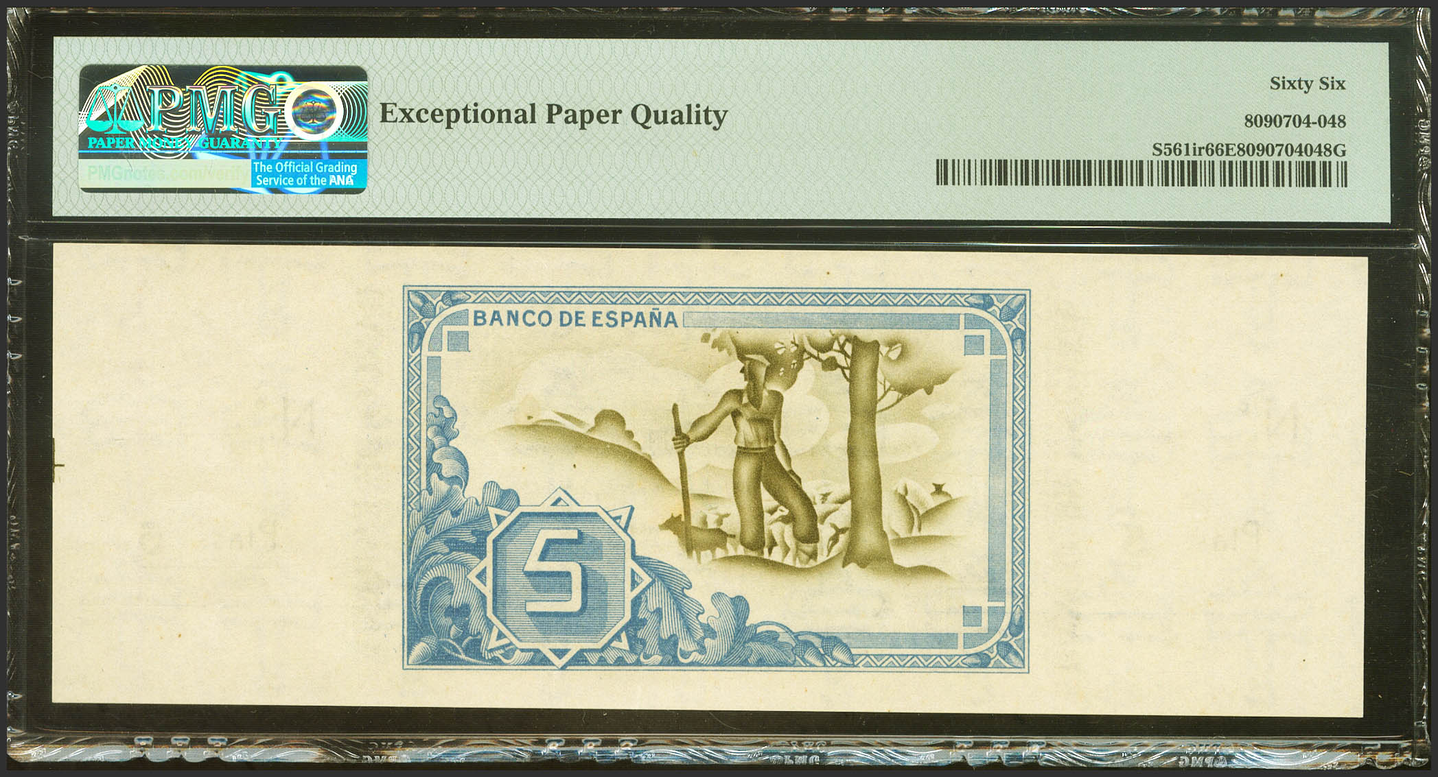 5 Pesetas. January 1, 1937. Bilbao Branch, Central Bank presignature. Series A and without numbering, with both matrices. (Edifil 2023: 386b, Pick: S561ir). Original sizing. Uncirculated. PMG66EPQ package.