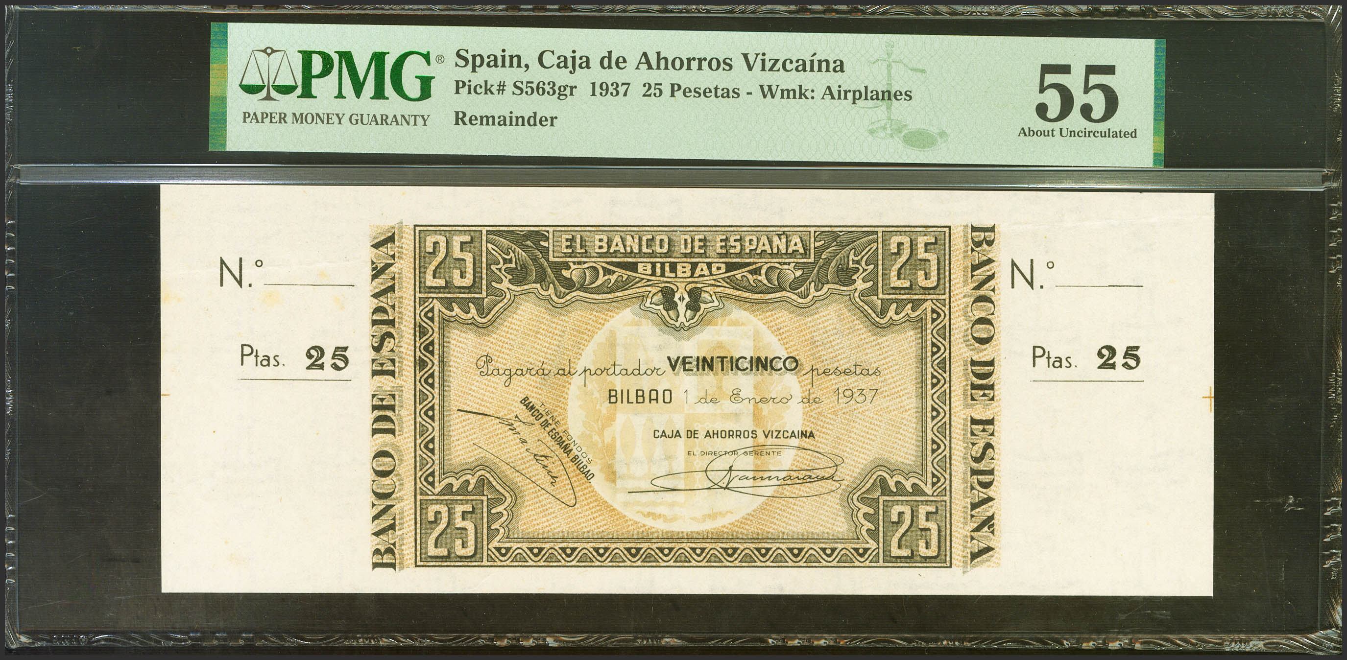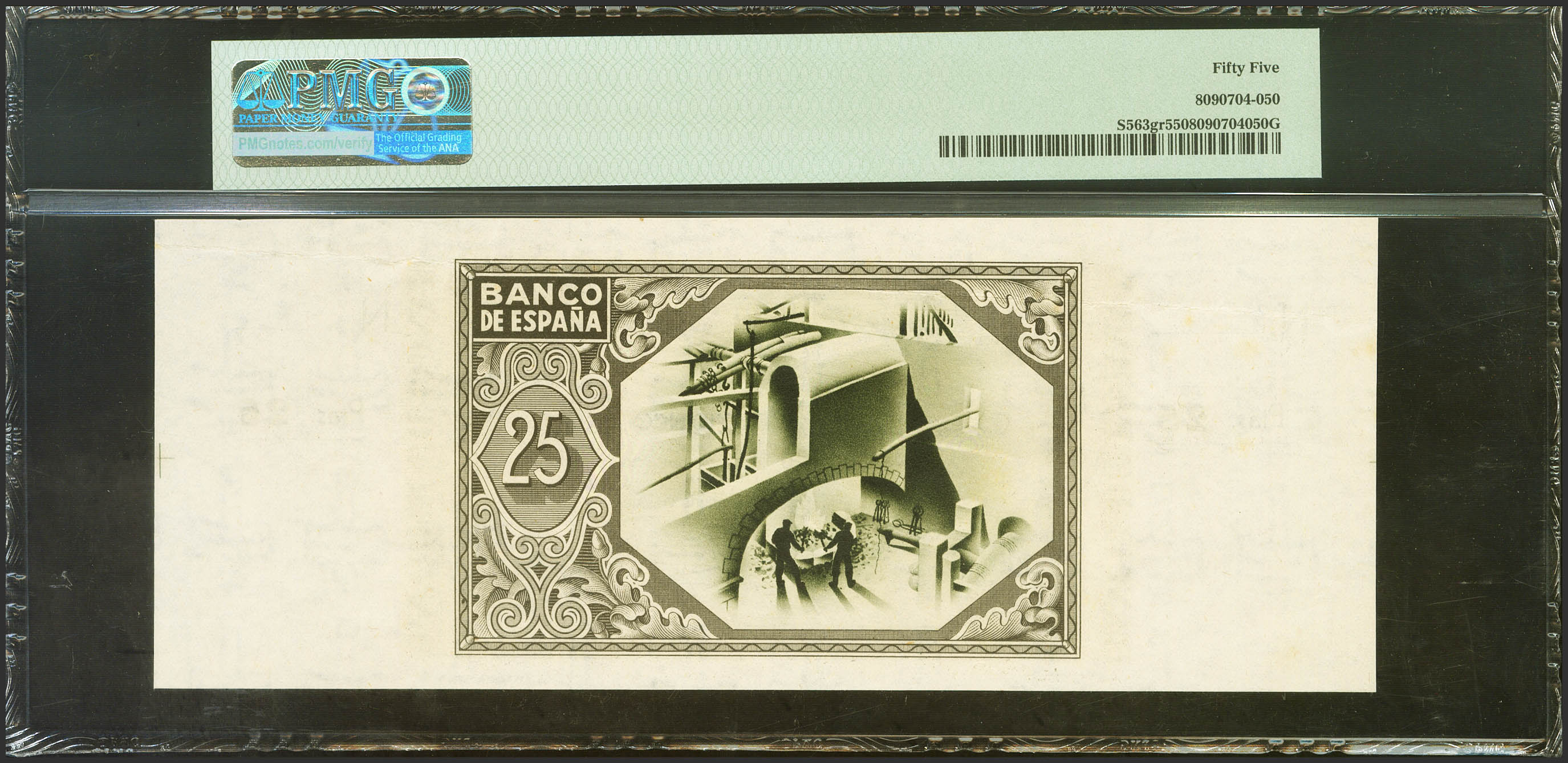 25 Pesetas. January 1, 1937. Bilbao branch, presigned by Caja de Vizcaína. Without series and without numbering, with both matrices. (Edifil 2023: 388a, Pick: S563gr). Good Extremely Fine. PMG55 encapsulation.